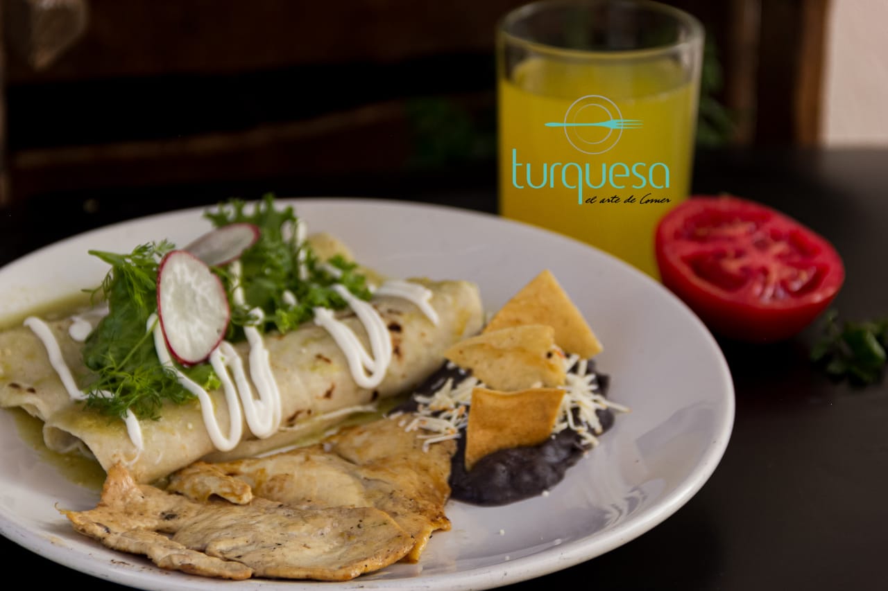 Dos enchiladas rellenas de pollo en salsa verde o roja, preparadas con lechuga, queso y crema, acompañada de pechuga asada y frijoles de la casa.