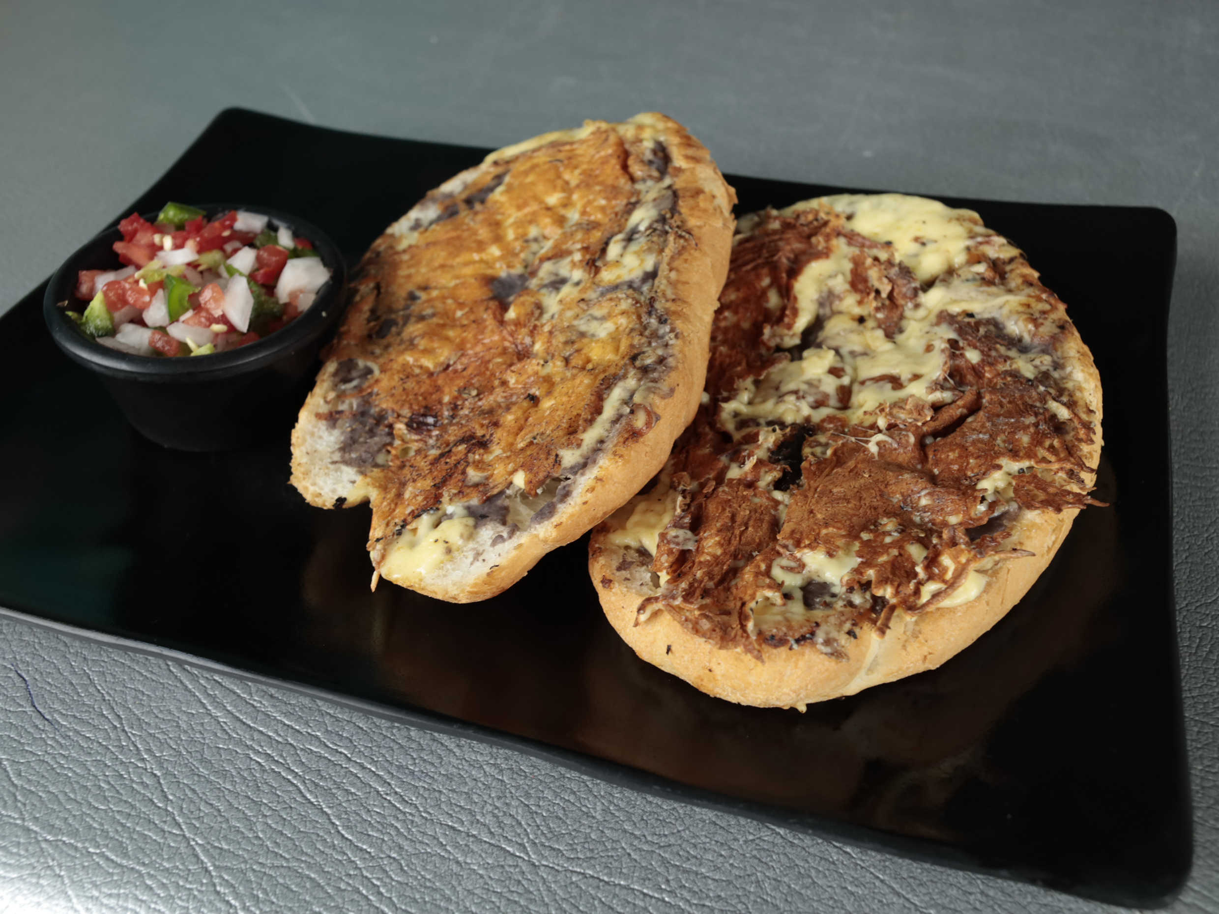 2 Molletes preparados con frijoles y queso manchego, servidos con pollo, longaniza, jamon o juevo. Acompañados con pico de gallo.