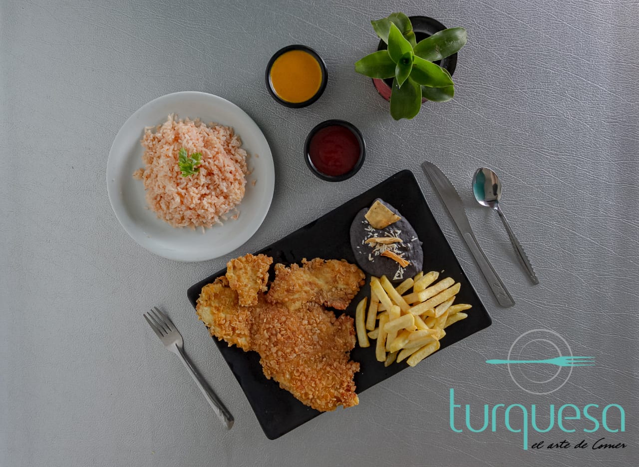Pechuga cruji, acompañada de papas a la francesa y frijoles refritos con totopos.