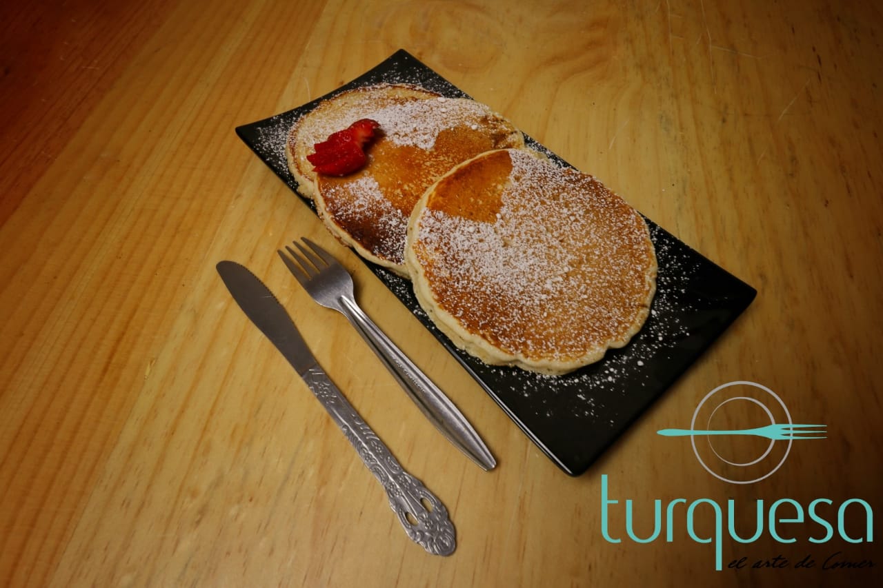 Esponjosos hot cakes (3) con miel o mermelada de fresa.