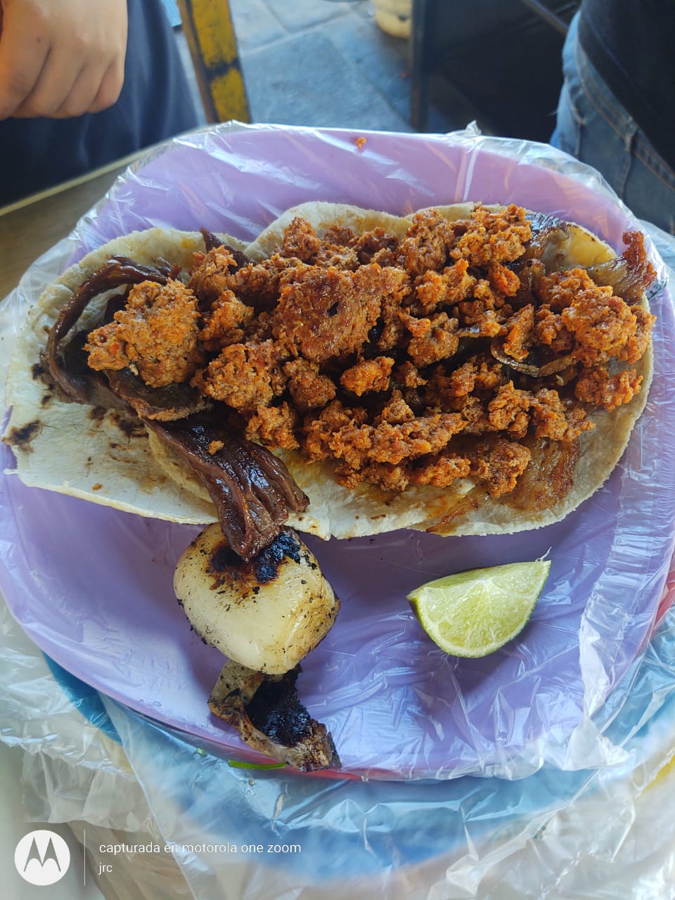 Gorditos asados, con 3 tortillas y limon, cebolla y salsa vere ,nopales y crema.