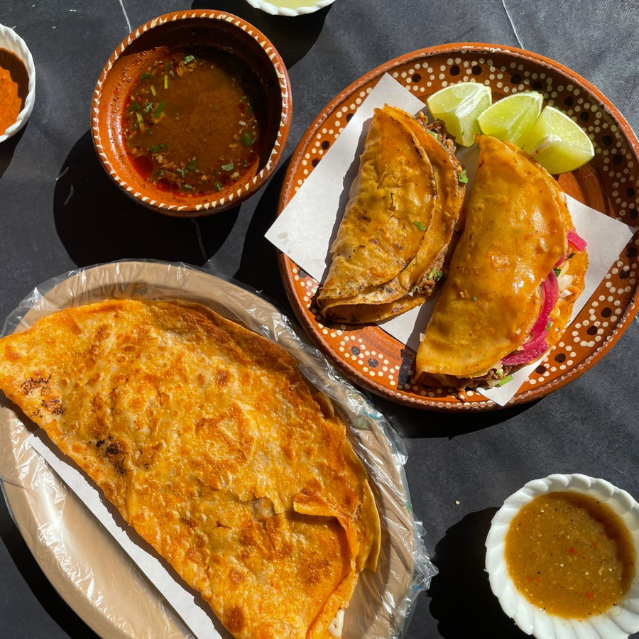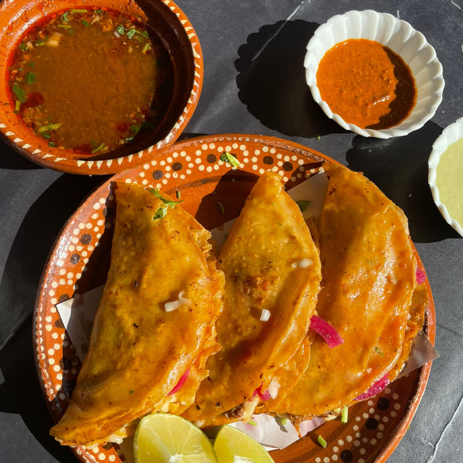 Quesabirria de Harina, quesabirria de maíz, taco de birria y consomé