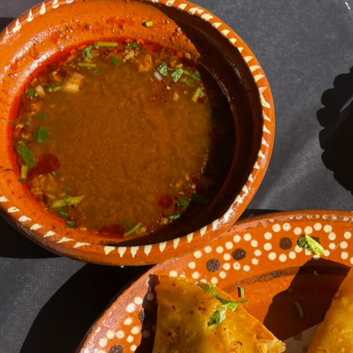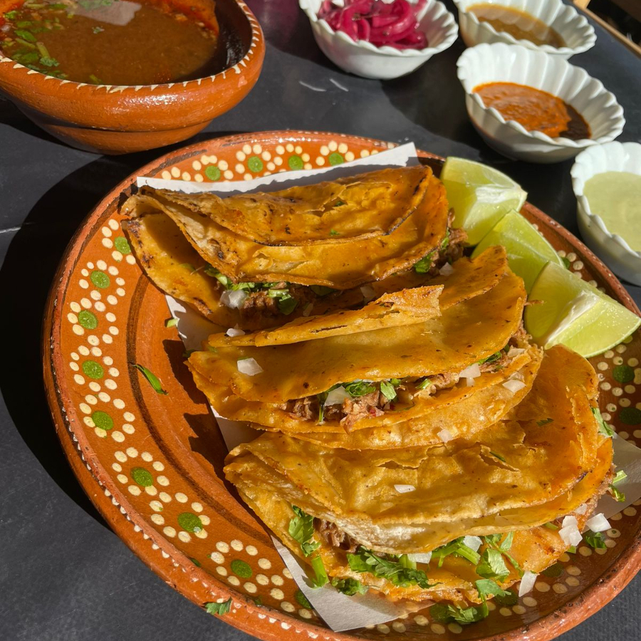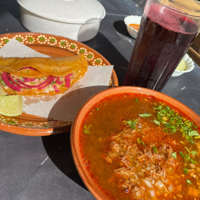 Plato de birria caldoso estilo Jalisco con tortillas, quesadilla de maíz y agua fresca.