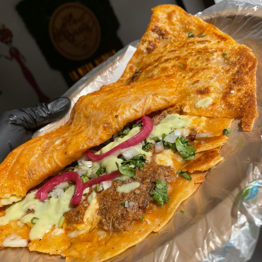 Con totilla de harina pochada tamaño burro, queso manchego y birria