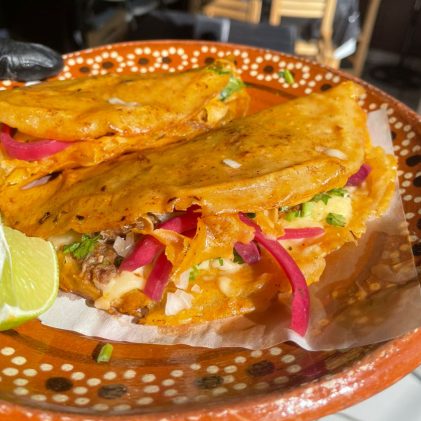 Quesabirria de Harina, dos tacos de birria y consomé.