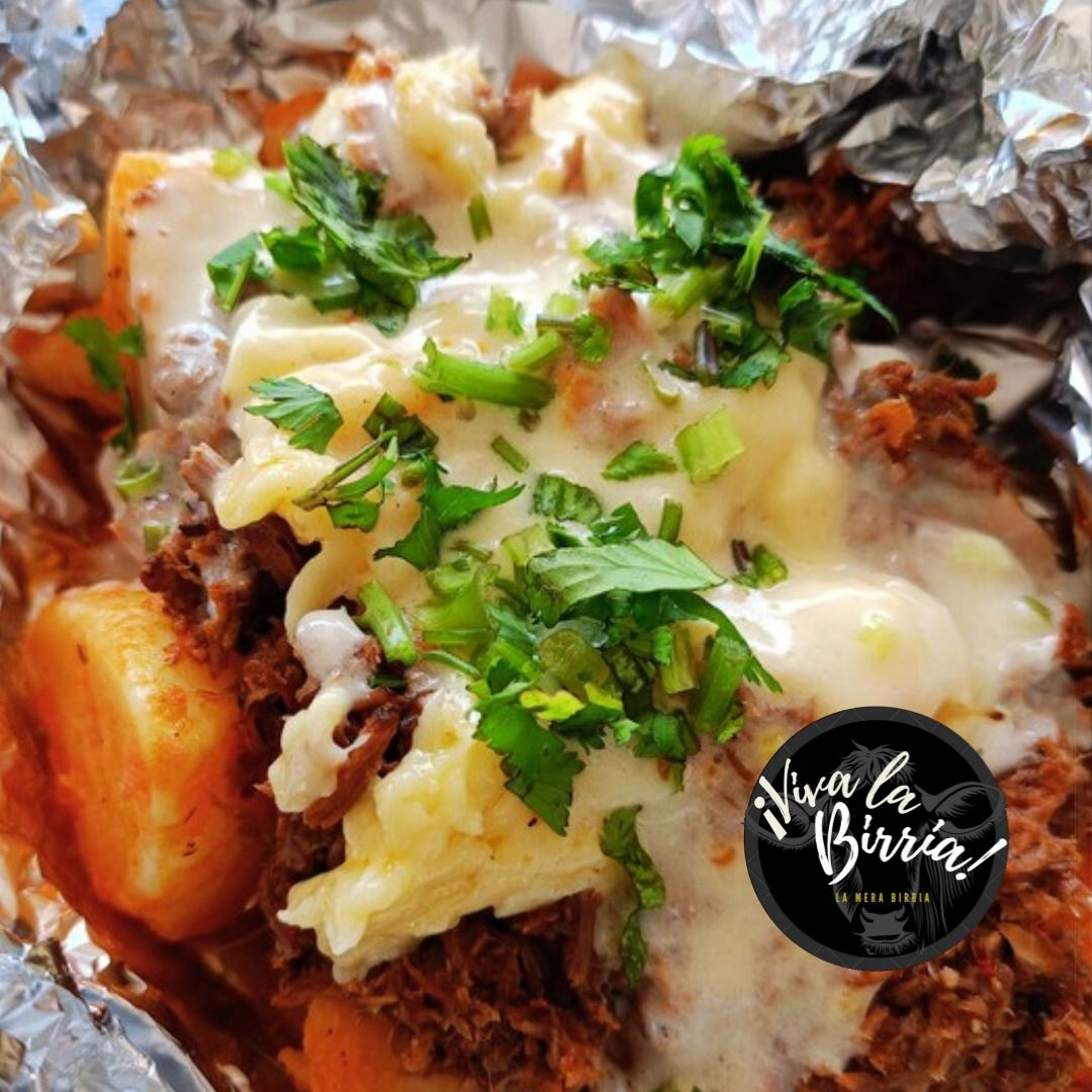 Papa cocida con queso manchego derretido, birria y aderezo de crema, mantequilla y cebollin, montado con cilantro y cebolla morada encurtida