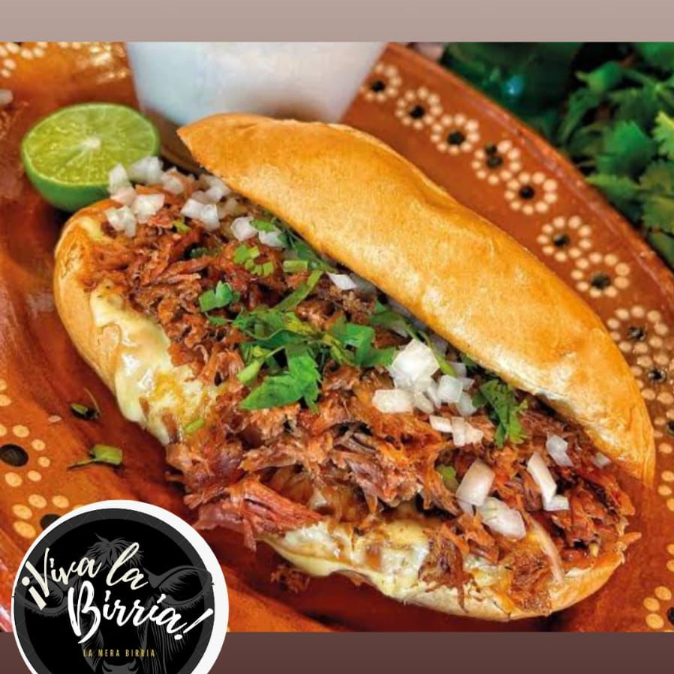 Torta de birria con queso derretido, frijoles, mayonesa, aguacate y cebolla morada encurtida.