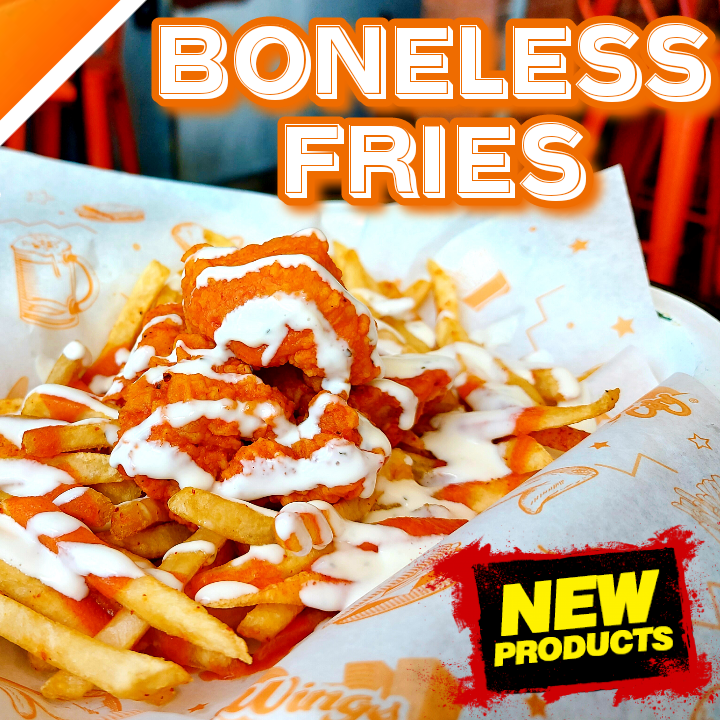 Deliciosas papas a la francesa acompañadas de nuestros famosos Boneless bañados en salsa Original Hot on un toque de aderezo Ranch.