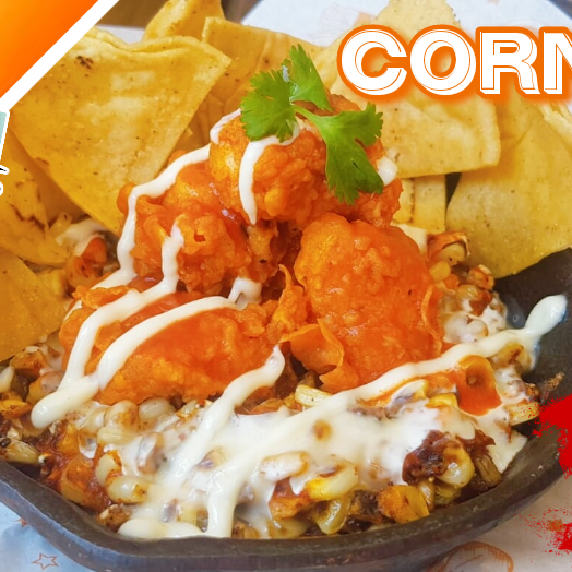 Esquites Asados, con deliciosa salsa de queso, acompañados de Boneless on salsa Original Hot, con n toque de mayonesa y unos crujientes topos.