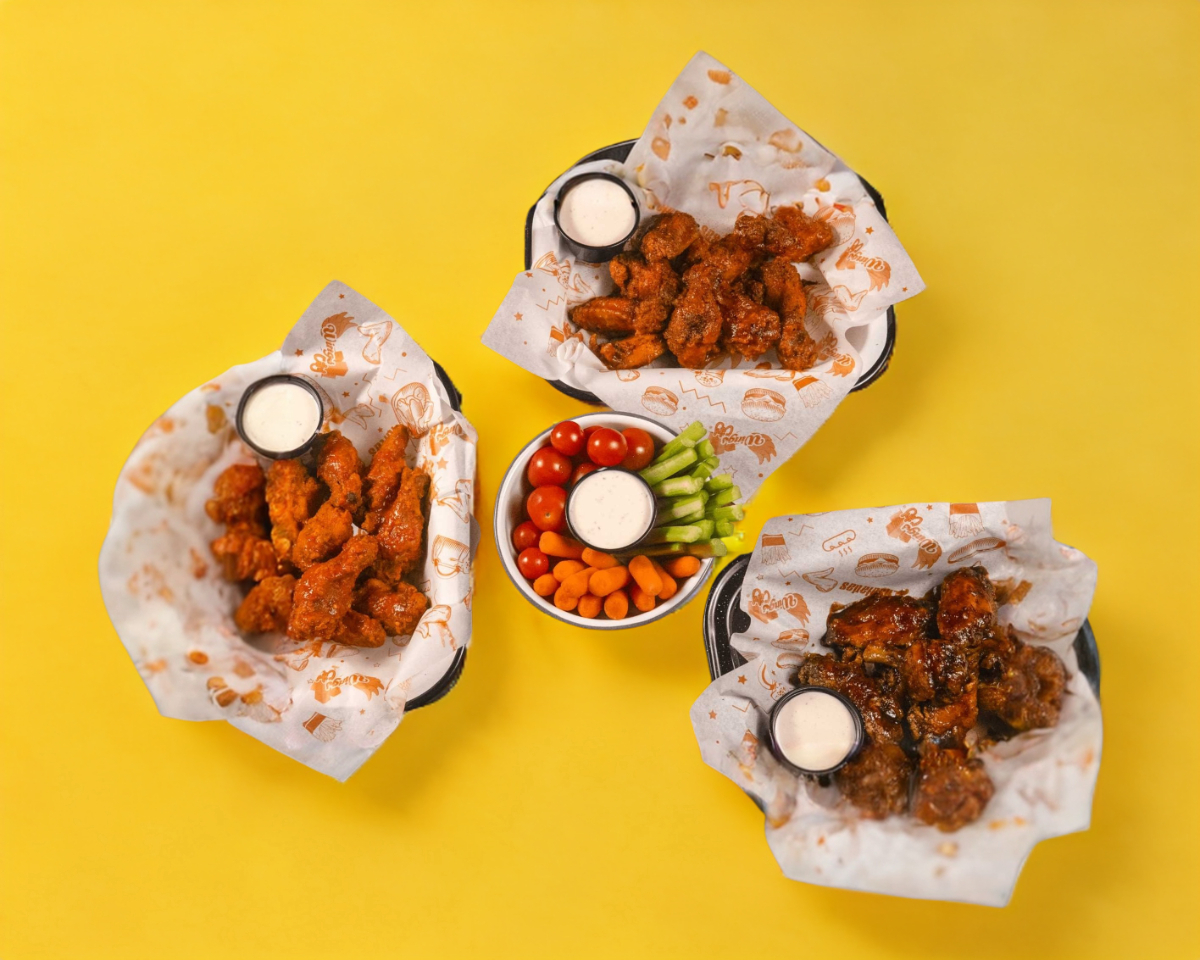 30 alitas + crunchy jalapeño poppers o munchers jalapeño + Wings City Fries o Crispy Onion Rings + Fresh Veggies + 3 bebidas (refrescos de lata).