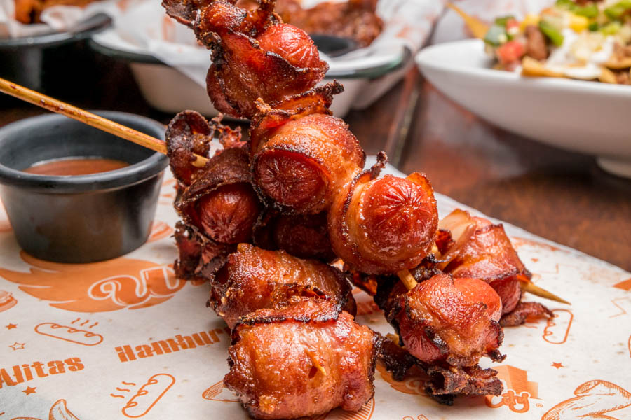 Brochetas de salchicha envueltas en crujientes tiras de tocino, acompañadas de nuestra tradicional salsa BBQ, 3 brochetas.