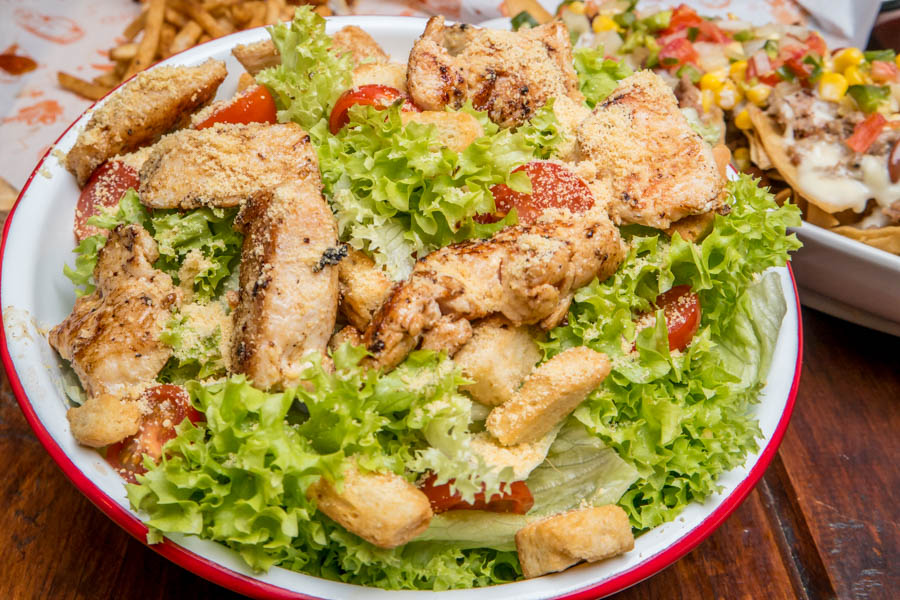 Fajita de pollo a la parrilla 180 gramos, sobre fresca lechuga, tomates cherry, elotes, croutones y un toque de queso parmesano.