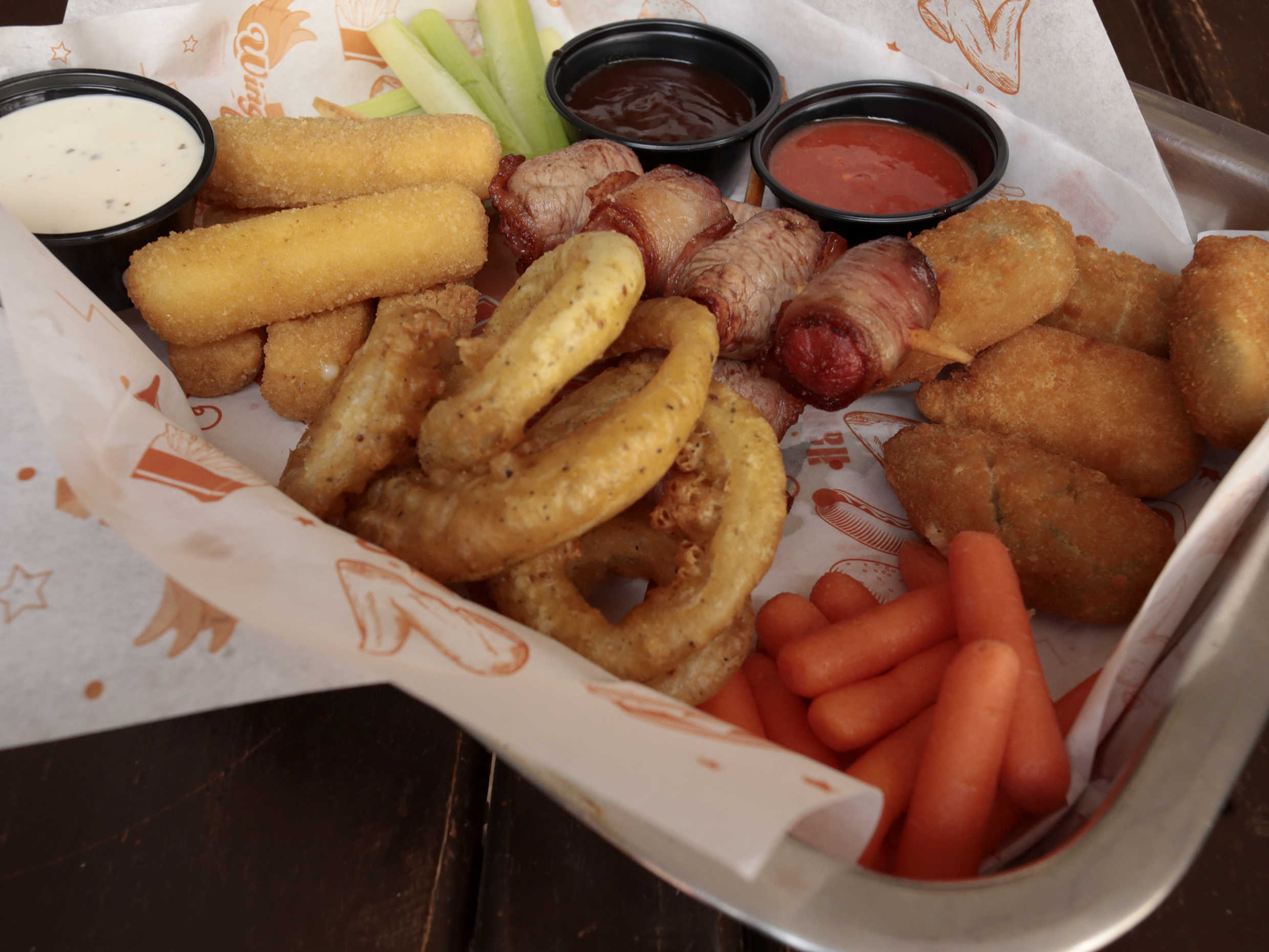 Deliciosa combinación de bacon bites 2 brochetas, crunchy jalapeño poppers, 3 piezas. Mozzarella sticks 3 piezas y munchers jalapeño 6 piezas, crispy onion rings 4 piezas, apios y zanahorias baby. Ideal para compartir con los amigos.