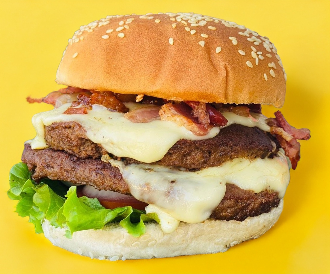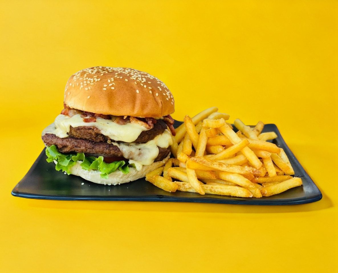 Doble carne de arrachera a la plancha 300g, queso manchego, tocino y 120g de papas a la francesa.