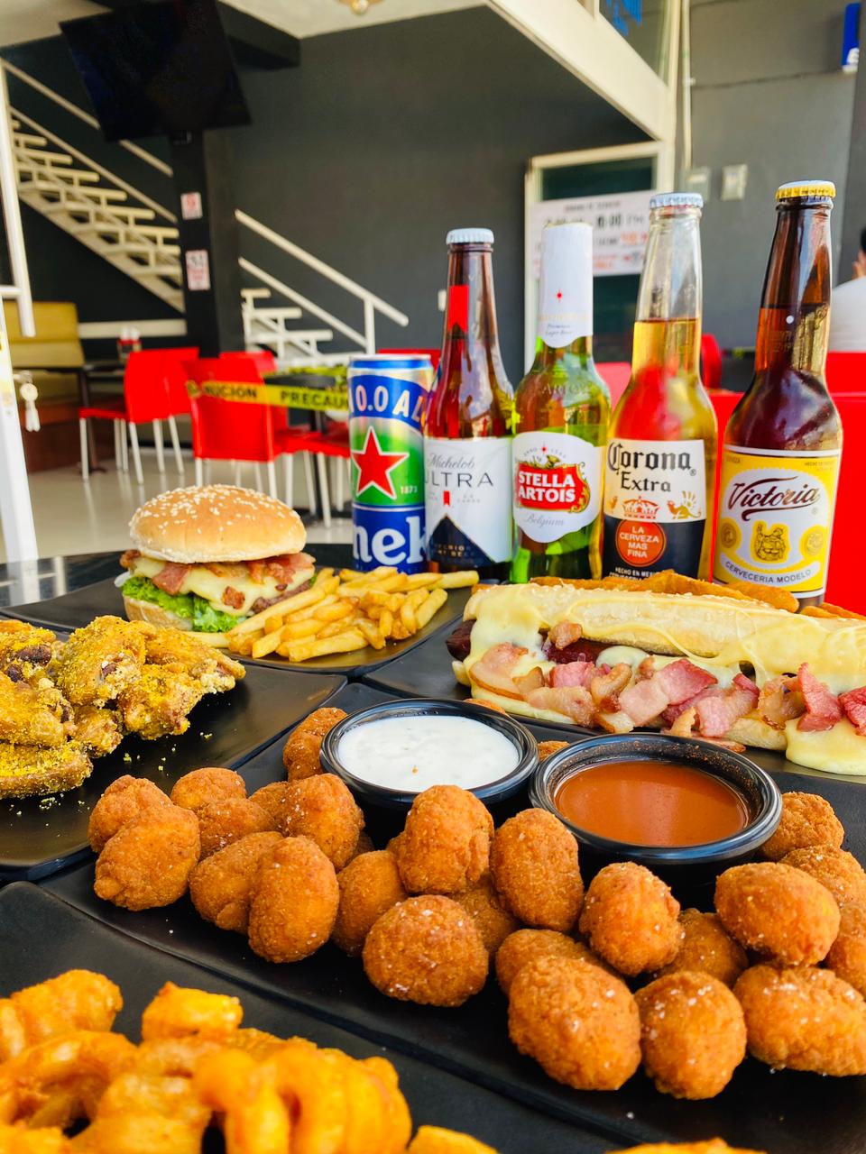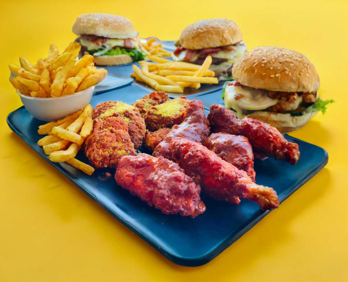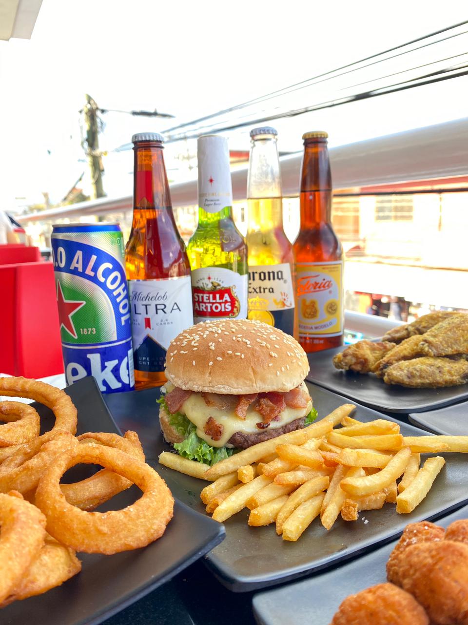 Deliciosa carne de res a la plancha 113g, jugosa piña, jamón a la plancha, queso manchego, tocino y 120g de papas a la francesa.
