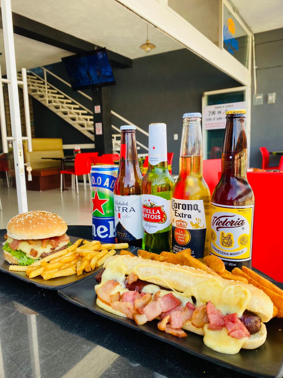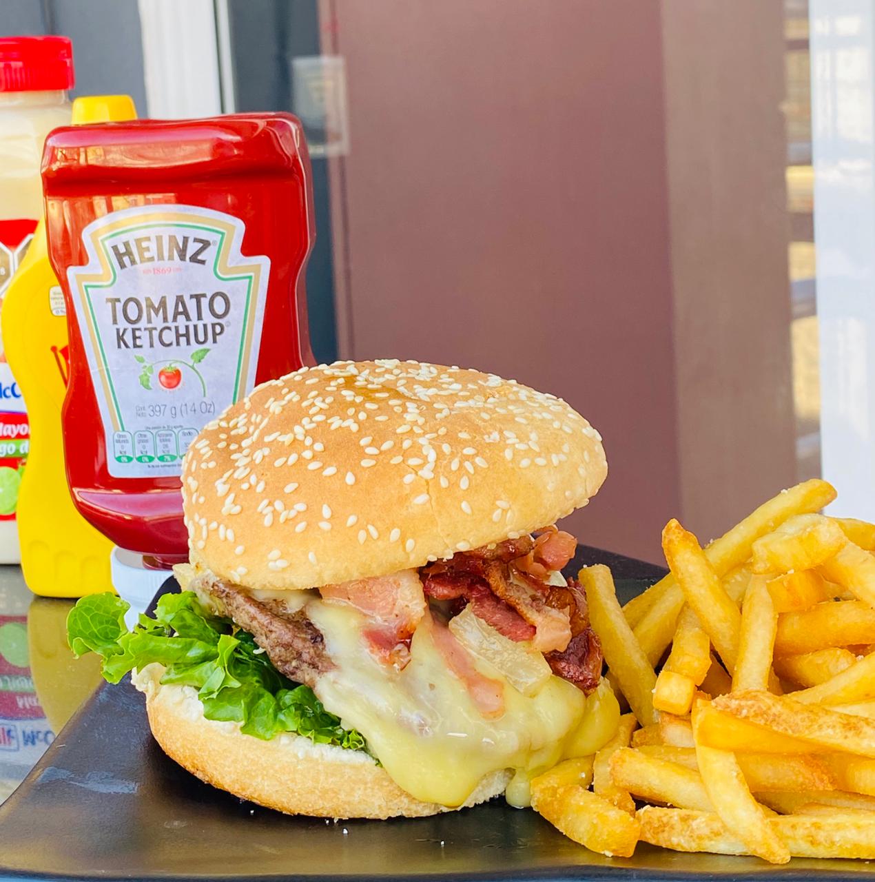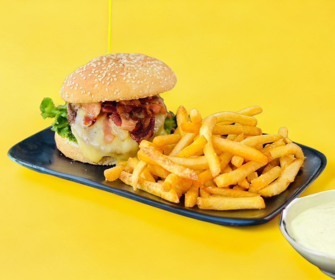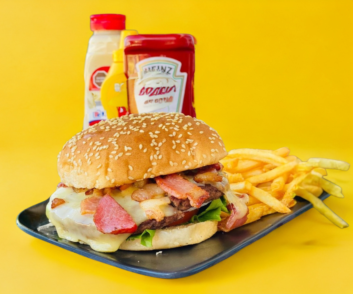 Deliciosa carne de res a la plancha 113g, queso manchego, tocino y 120g de papas a la francesa.