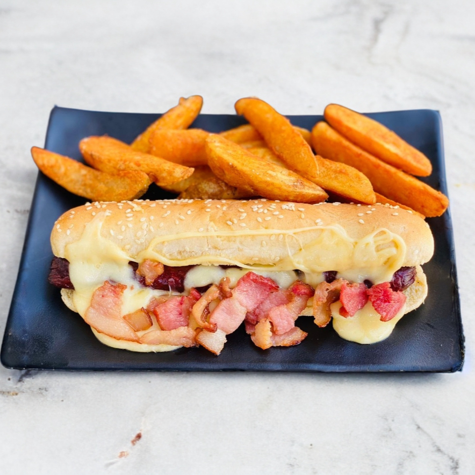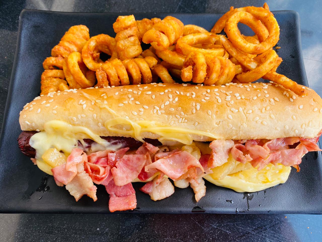 Deliciosa salchicha de res, rico tocino, queso manchego y 100g de papas gajo o curly.