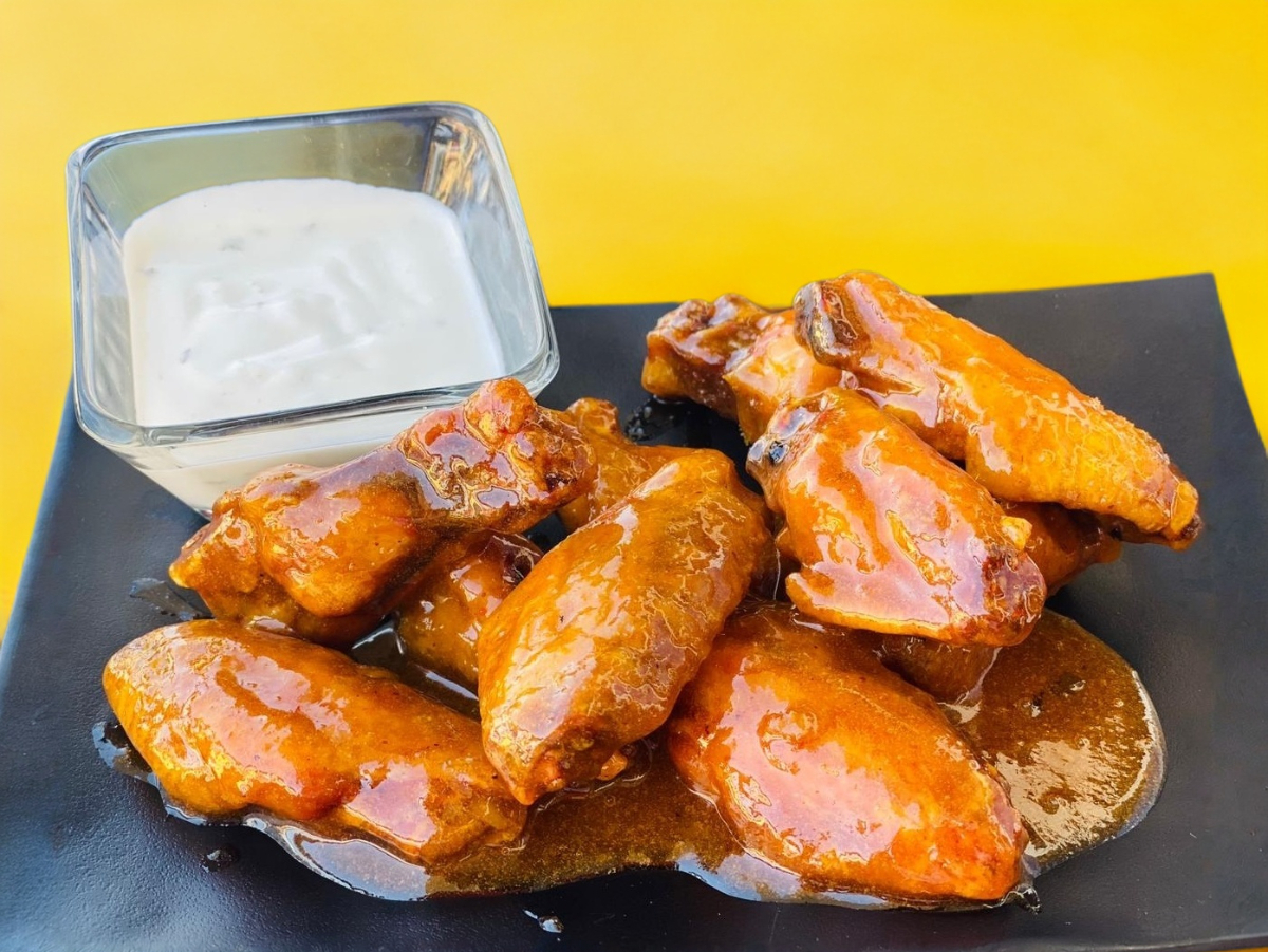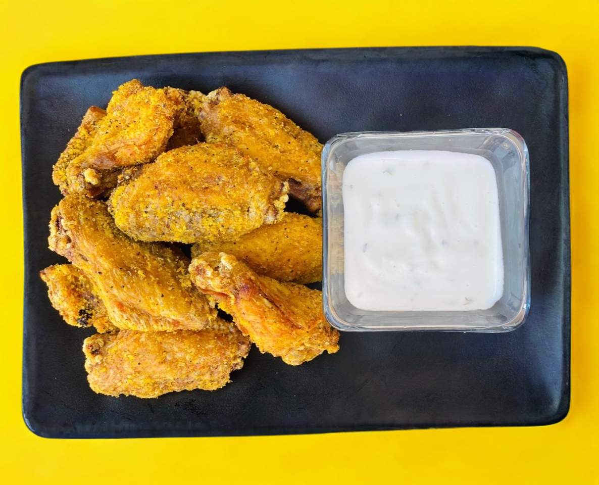10 Deliciosas alitas, 2 sabores a elegir, incluye 1 aderezo ranch.