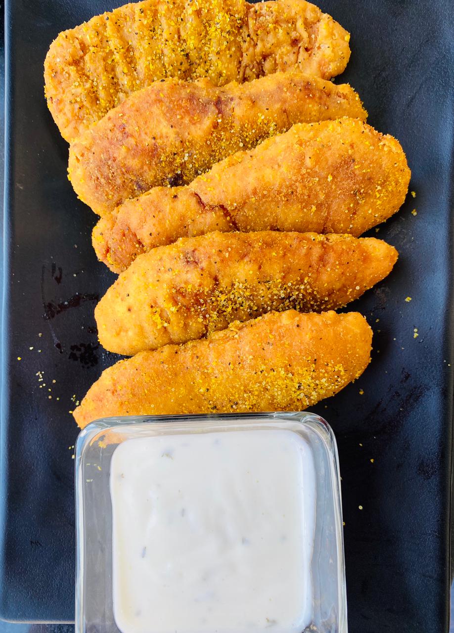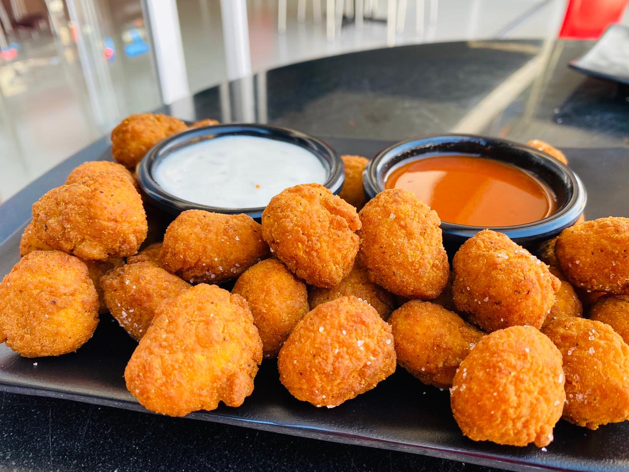 10 Piezas de deliciosos trocitos de pechuga de pollo empanizada bañados con la salsa de tu preferencia 2 sabores, acompañados con 1 aderezo ranch.