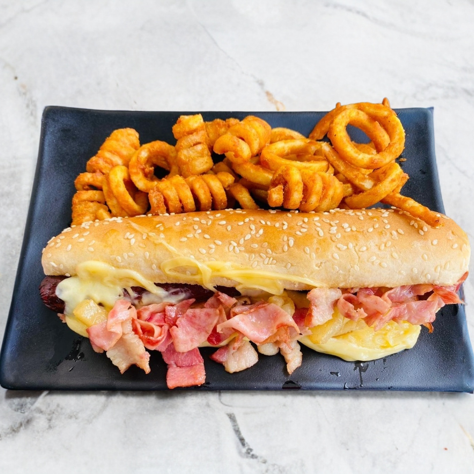Deliciosa salchicha de res, rico tocino, queso manchego, jugosa píña y jamón a la plancha, acompañado de 100g de papas gajo o curly.