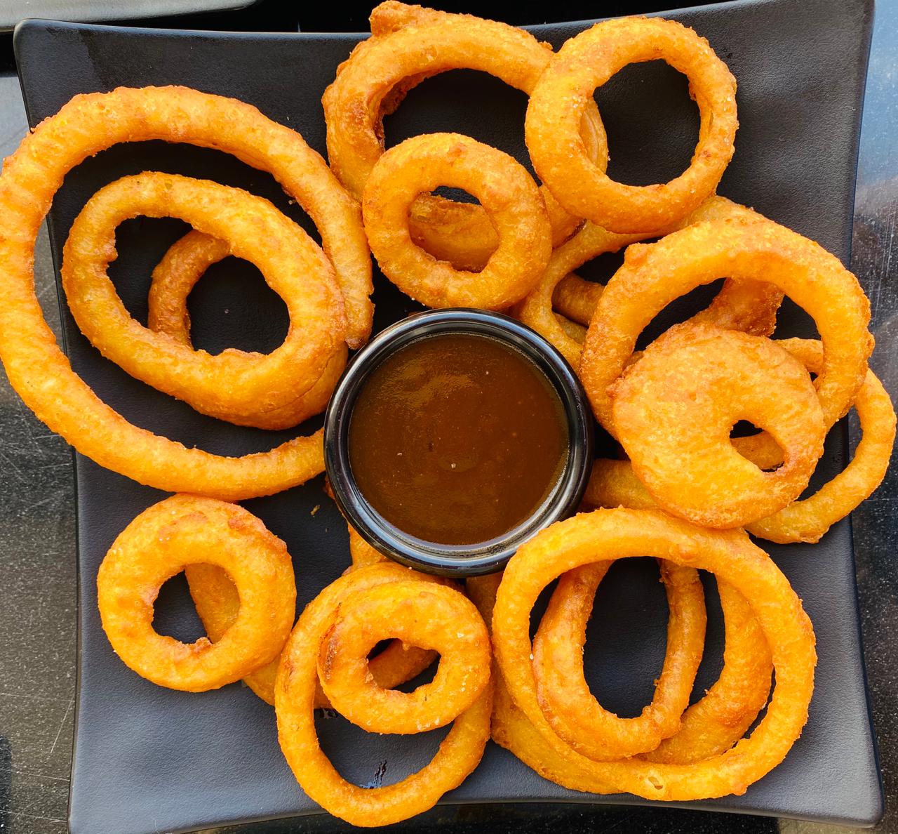 270 g de dulces aros de cebolla, capeados, fritos, acompañados de salsa BBQ.