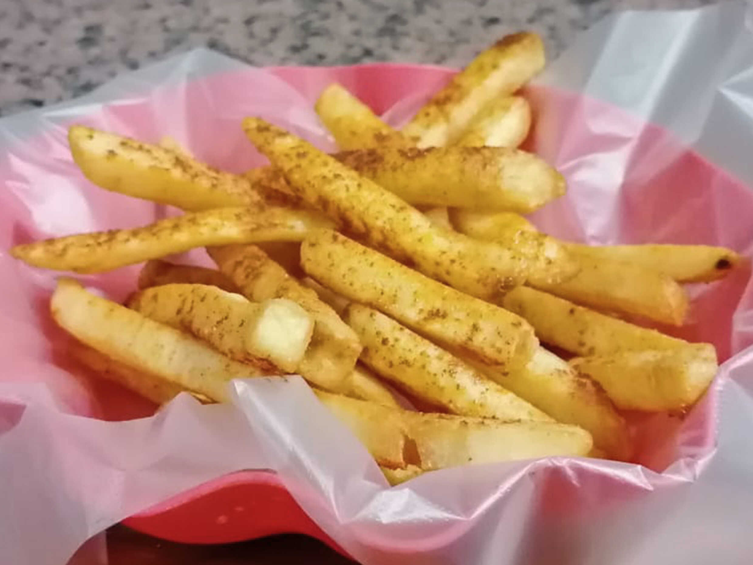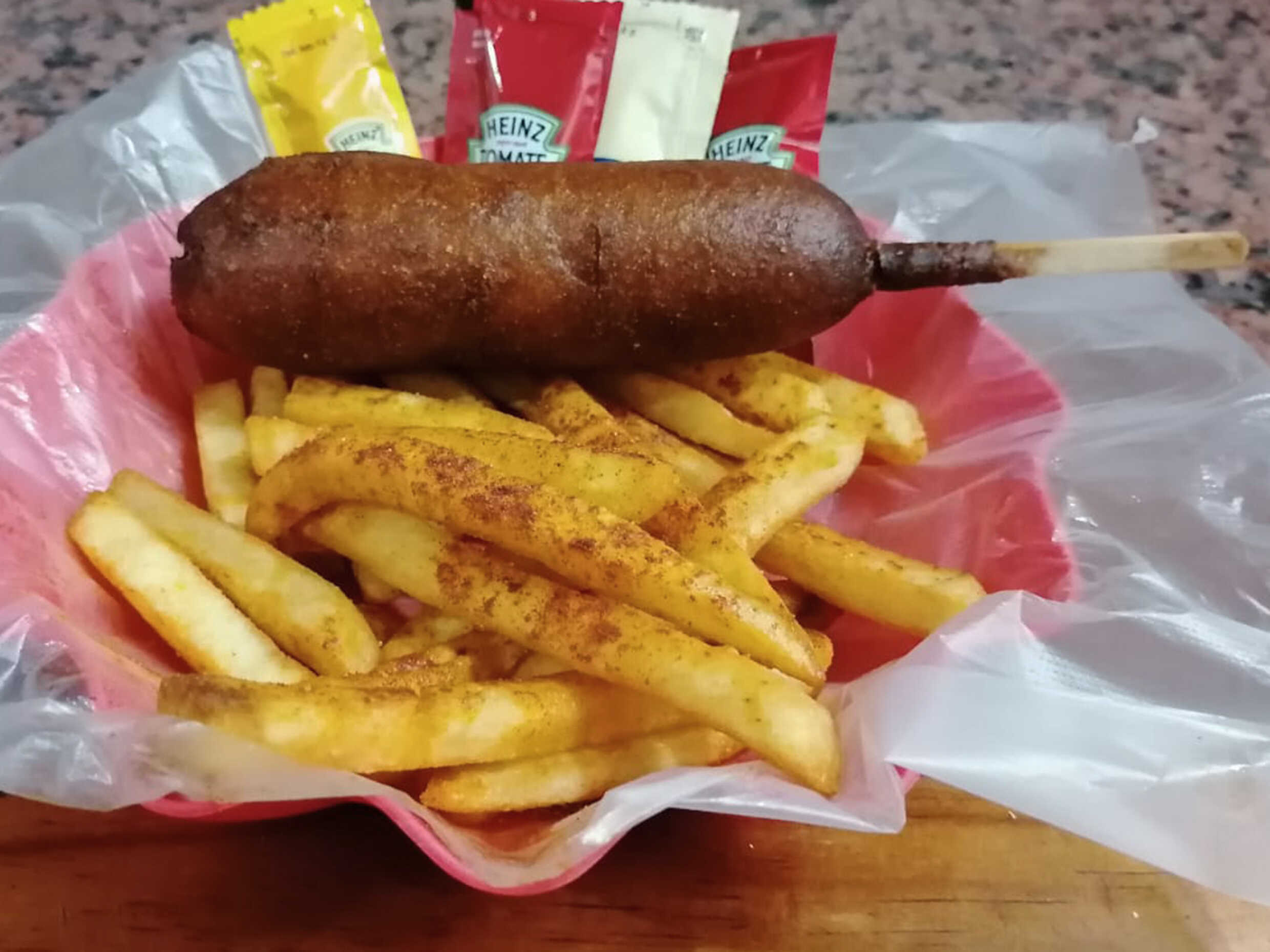 Deliciosas banderilla de salchicha de pavo grande con orden de papas a la francesa regulares.