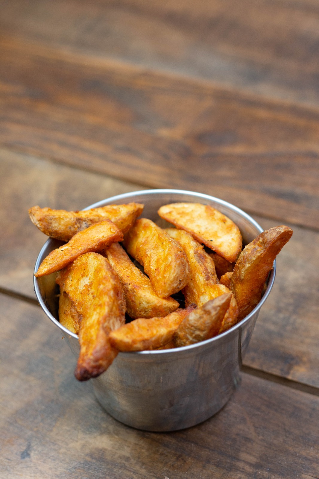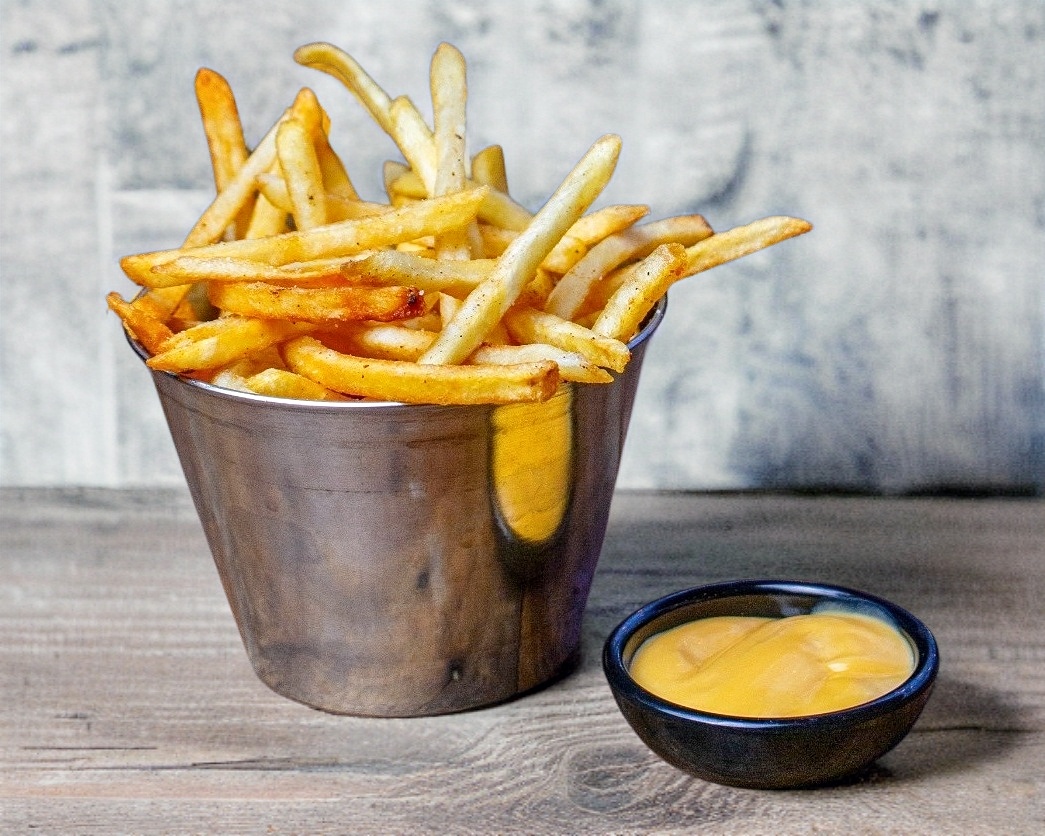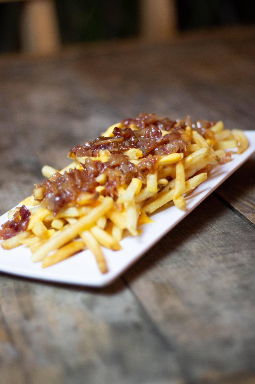 Papas a la francesa con mermelada de tocino y queso amarillo.