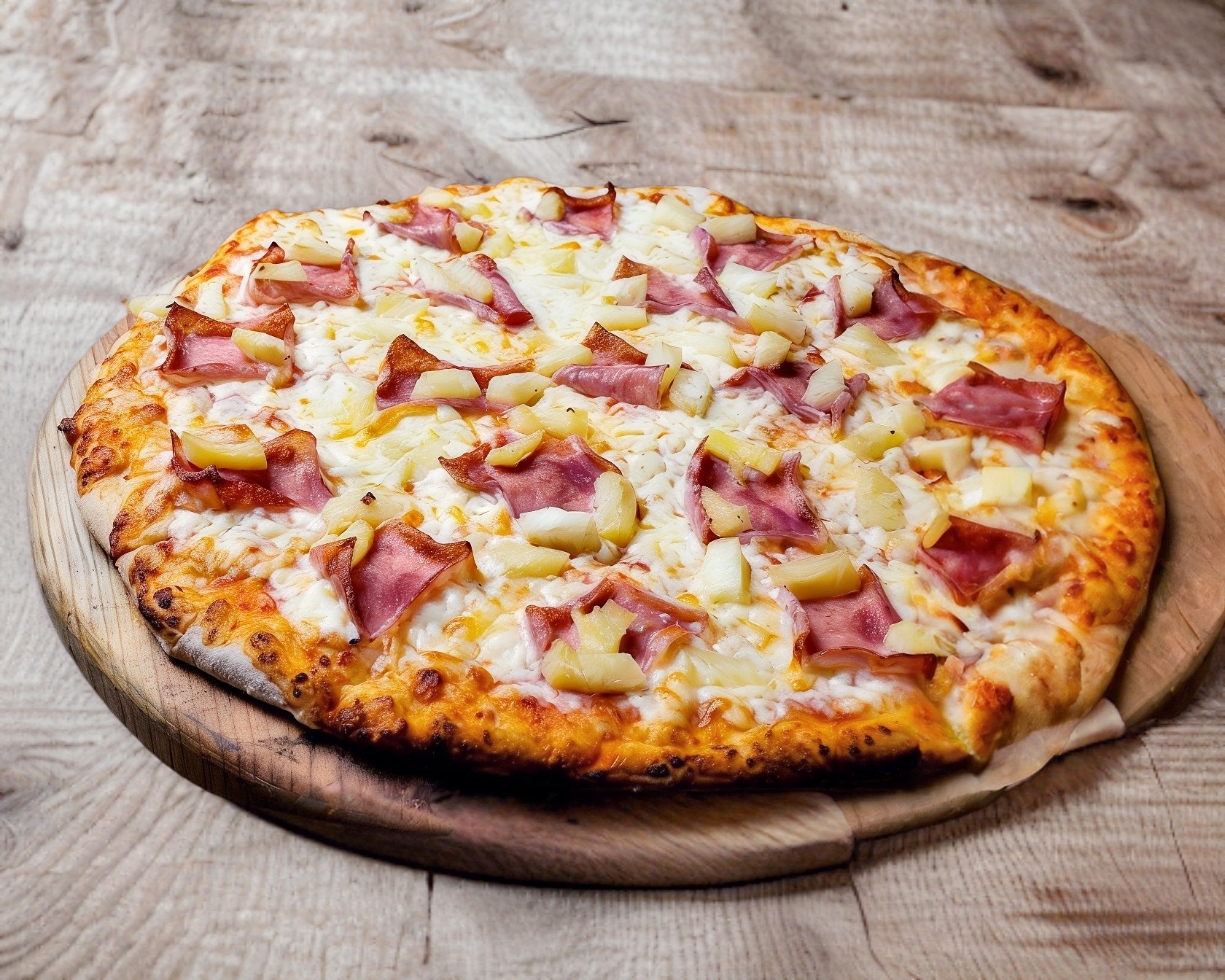 mezcla de quesos, salsa pomodoro, jamón y piña.