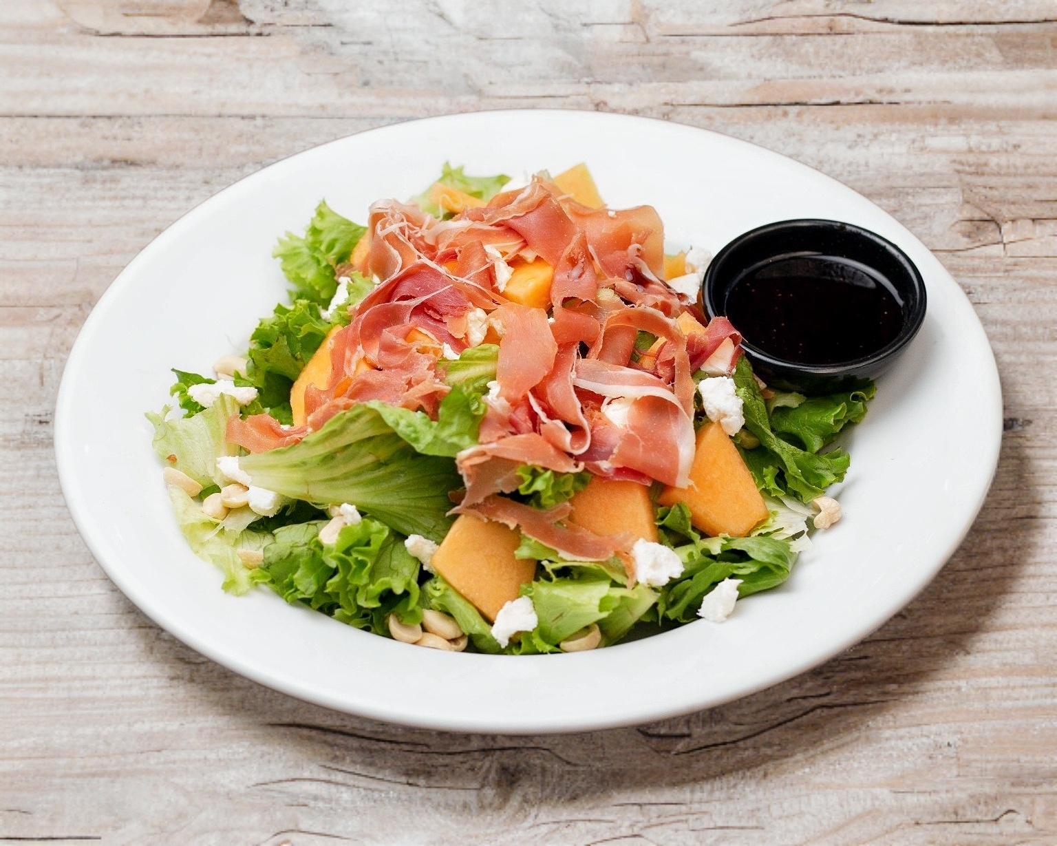 Mix de lechugas, melón fresco, cacahuate, jamón serrano y queso de cabra. Todas nuestras ensaladas incluyen reducción de balsámico.