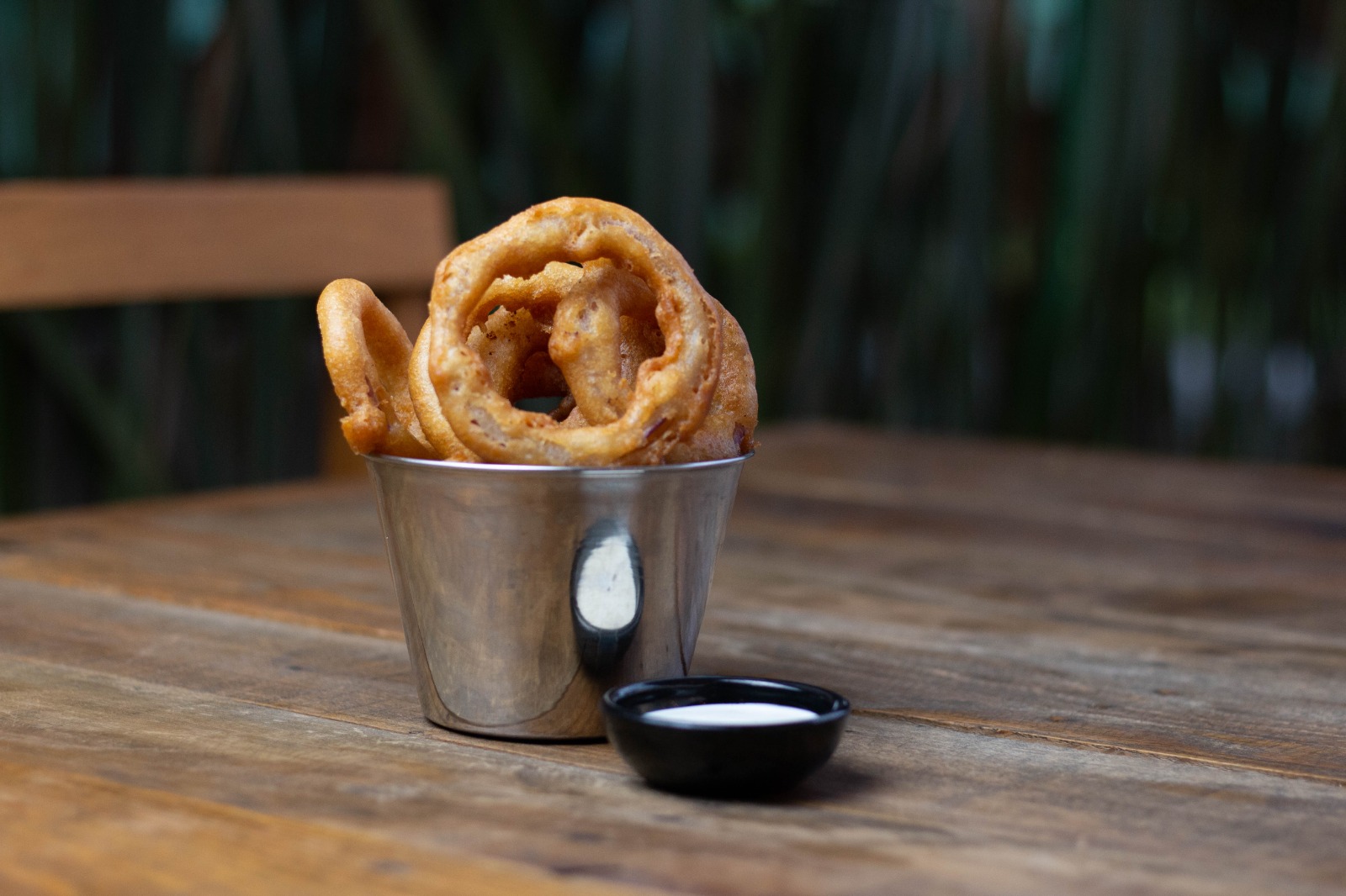 Carne, cebolla caramelizada, aros de cebolla, mix de quesos, salsa BBQ y vegetales.
