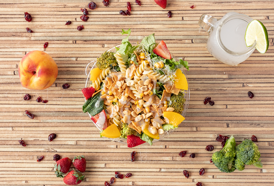 3 proteínas + 4 vegetales o fruta + 3 adicionales + aderezo.