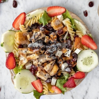 Pollo a la plancha, queso panela, cherry, pepino, zanahoria, semilla de girasol, ajonjolí negro.