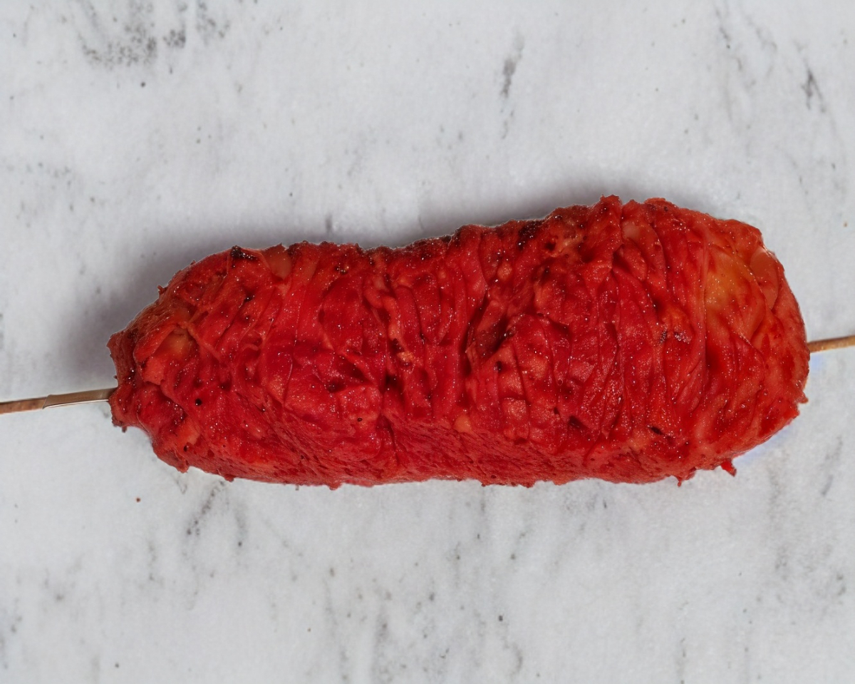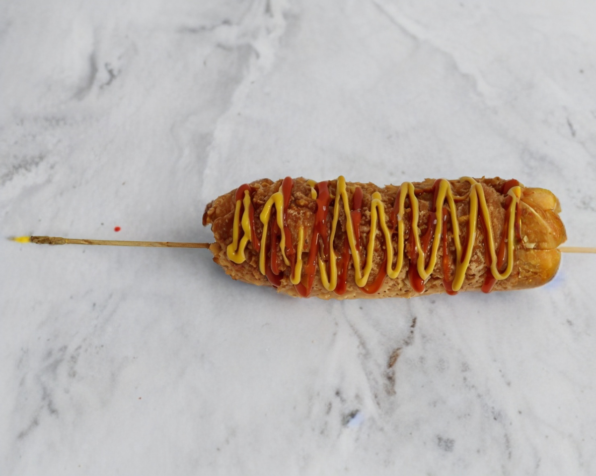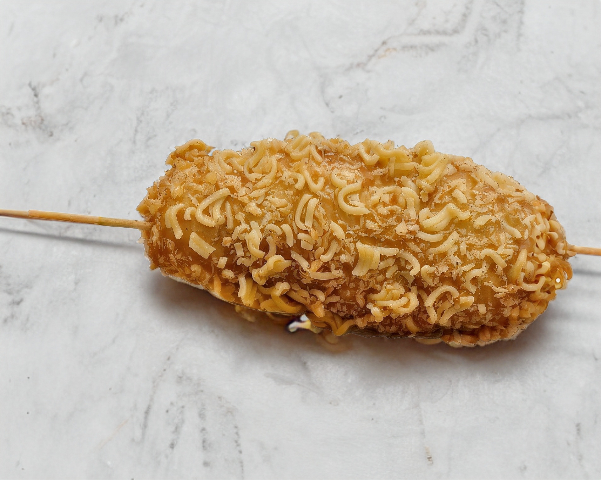 Empanizado con ramen y salchicha vegana.