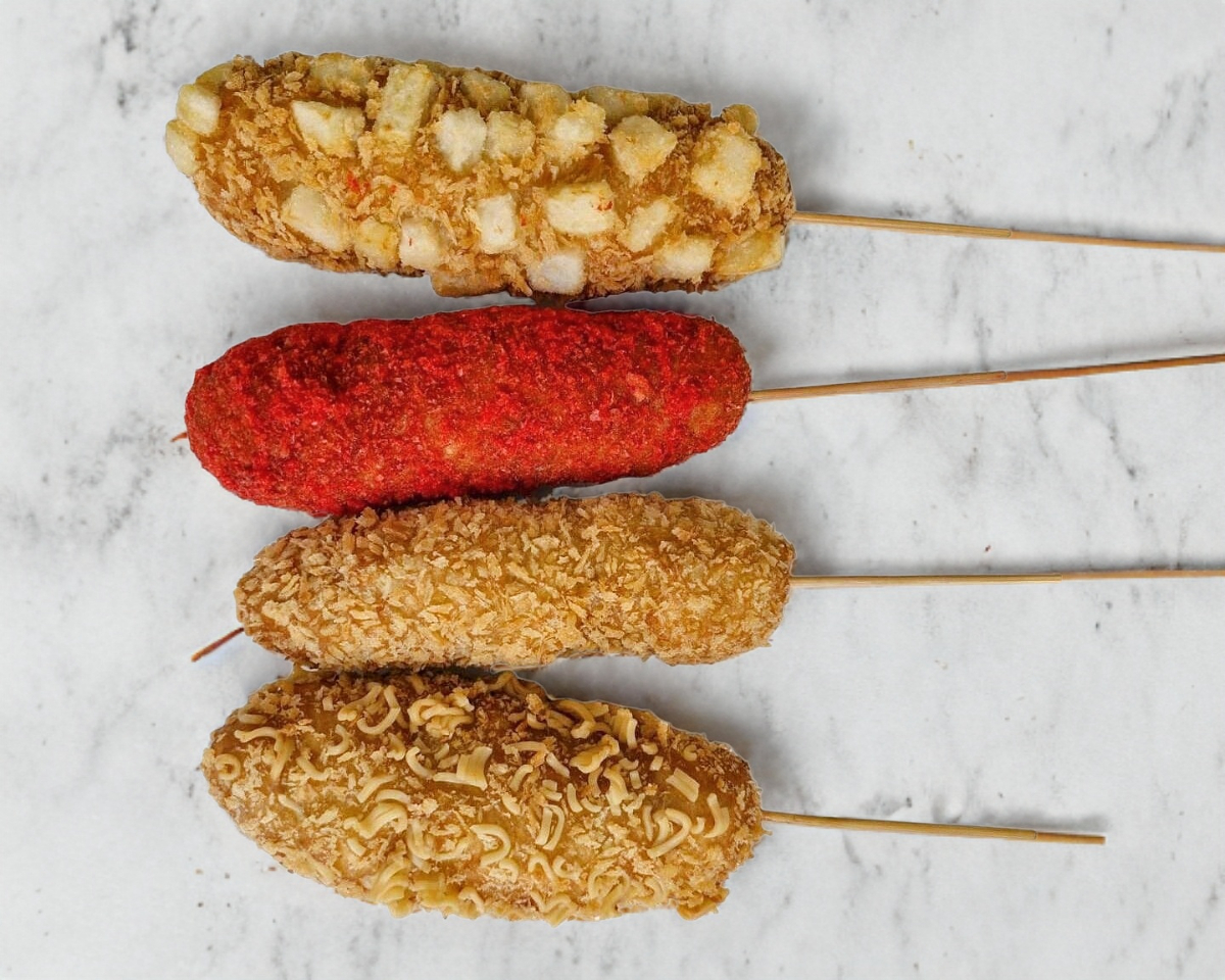 4 Banderillas coreanas (Tradicional salchicha, Flamin mixta, Ramen mixta, Papa mixta)