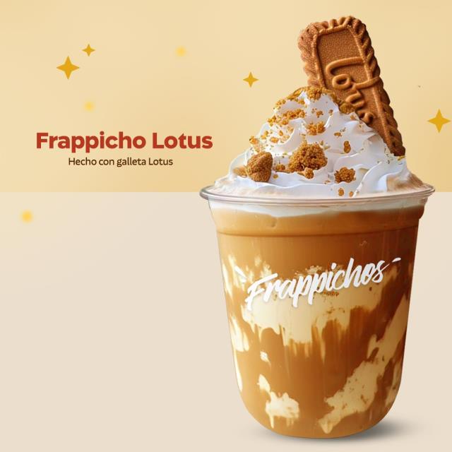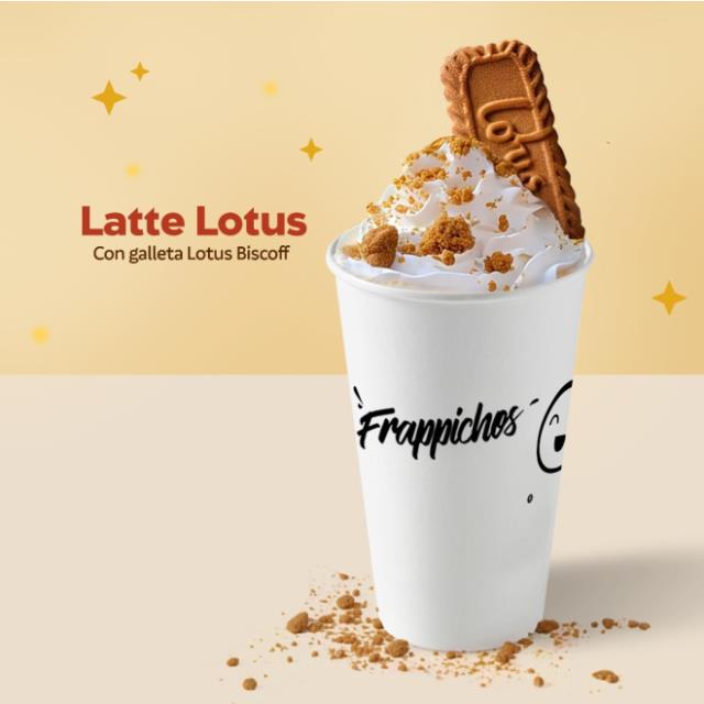 Frapicho elaborado con auténtica galleta LOTUS®, mezclado con una base de crema Lotus® en el vaso y coronado con suave crema batid para un sabor único