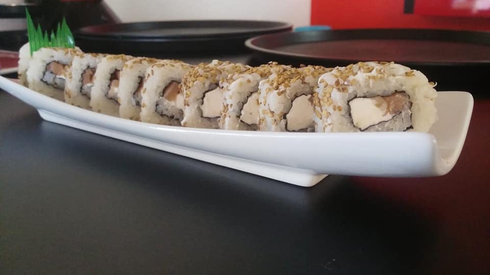 salmón fresco, aguacate y pepino por dentro., queso crema y mango por fuera., servido con nuestra salsa de tamarindo