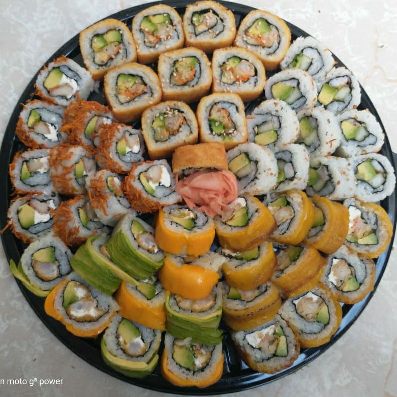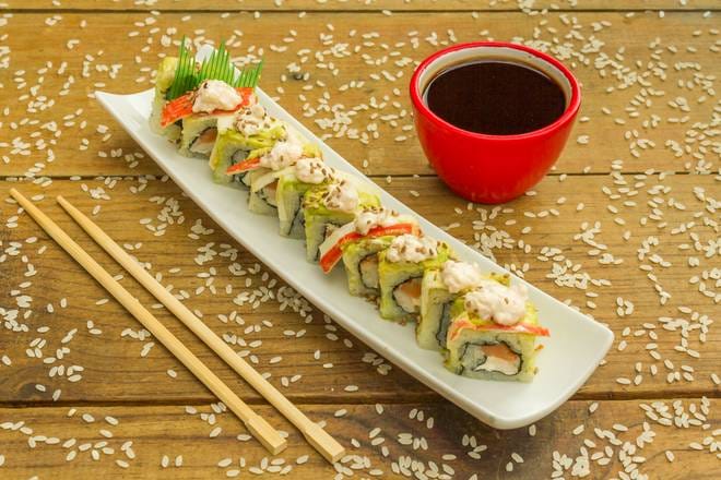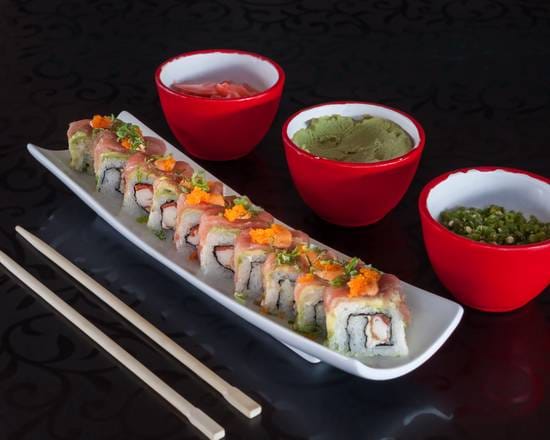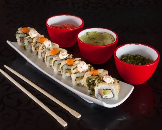 Pasta de cangrejo, aguacate y queso crema por dentro; salmon fresco por fuera; servido con salsa momiji, servido con salsa chipotle y salsa dulce.
