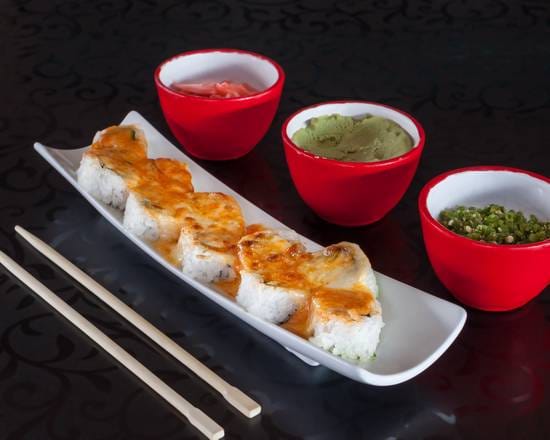 salmon fresco, aguacate y queso crema por dentro; queso gratinado con chipotle por fuera.
