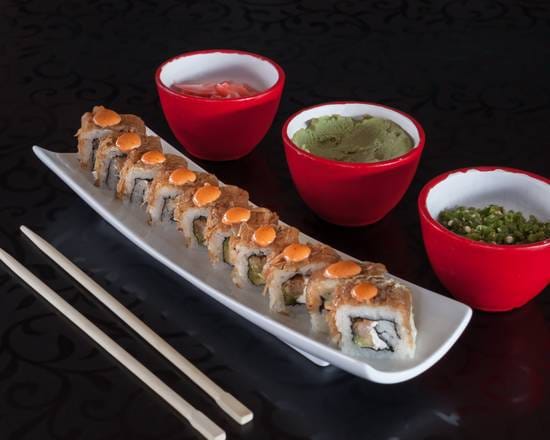 pasta de cangrejo empanizado, salsa tampico por dentro; Aguacate y atun por fuera; servido con masago, cebollin y salsa chipotle.
