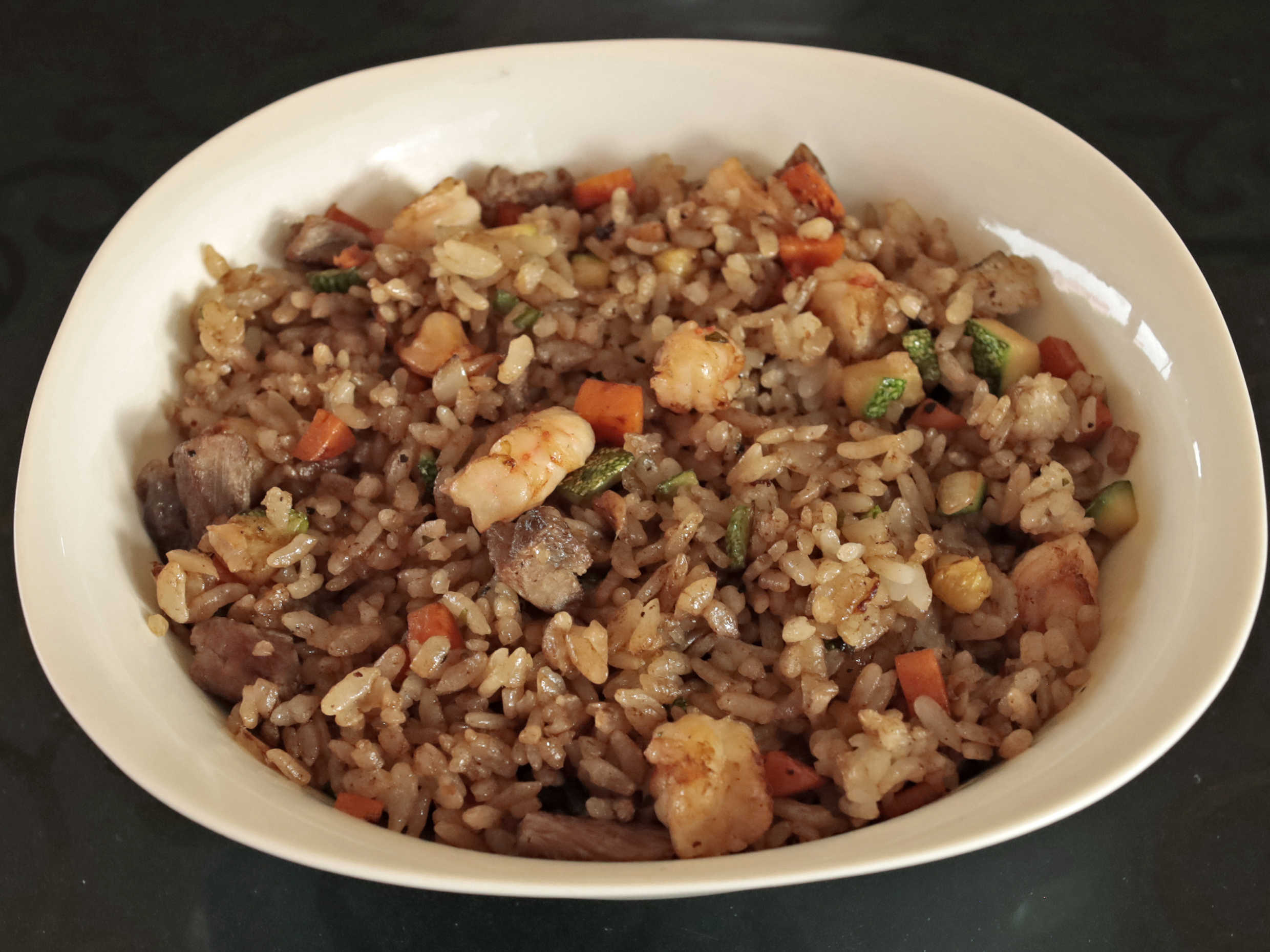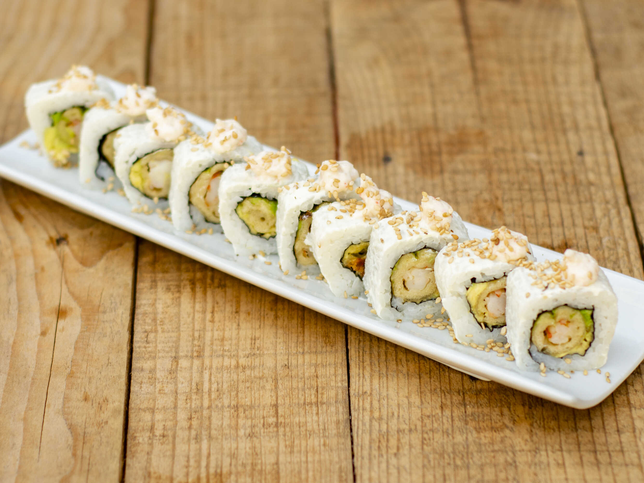Camarón, pepino y aguacate por dentro; ajonjolí por fuera.