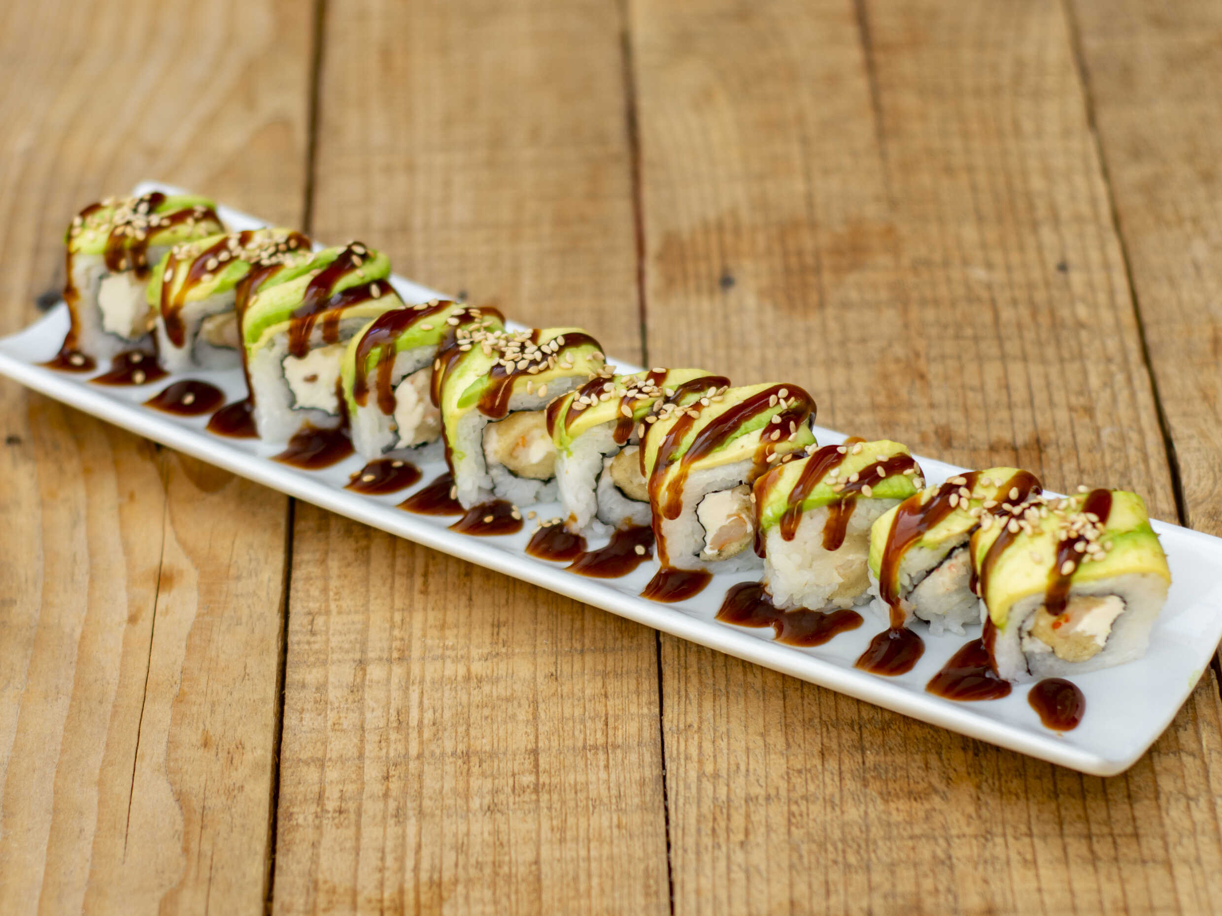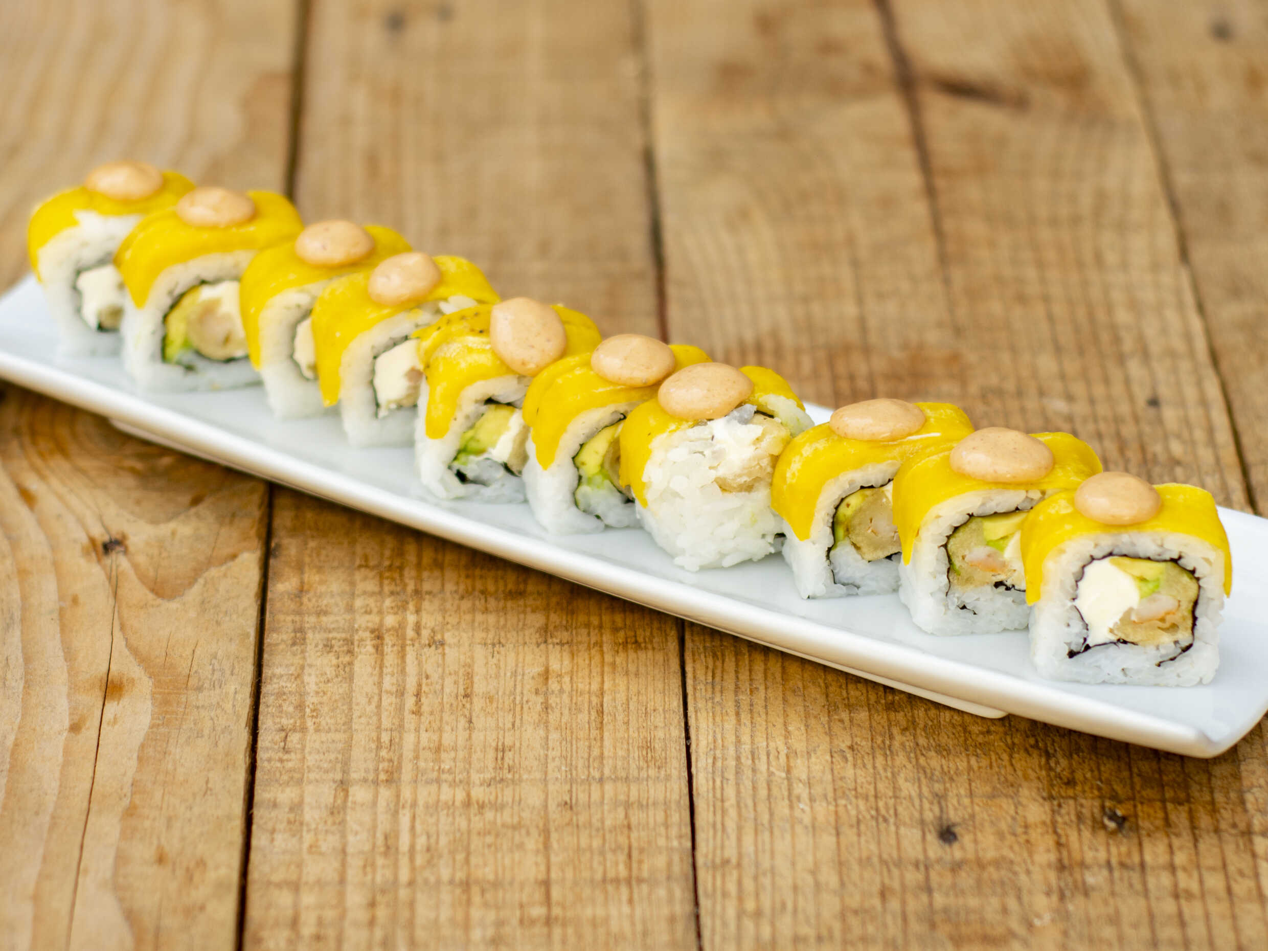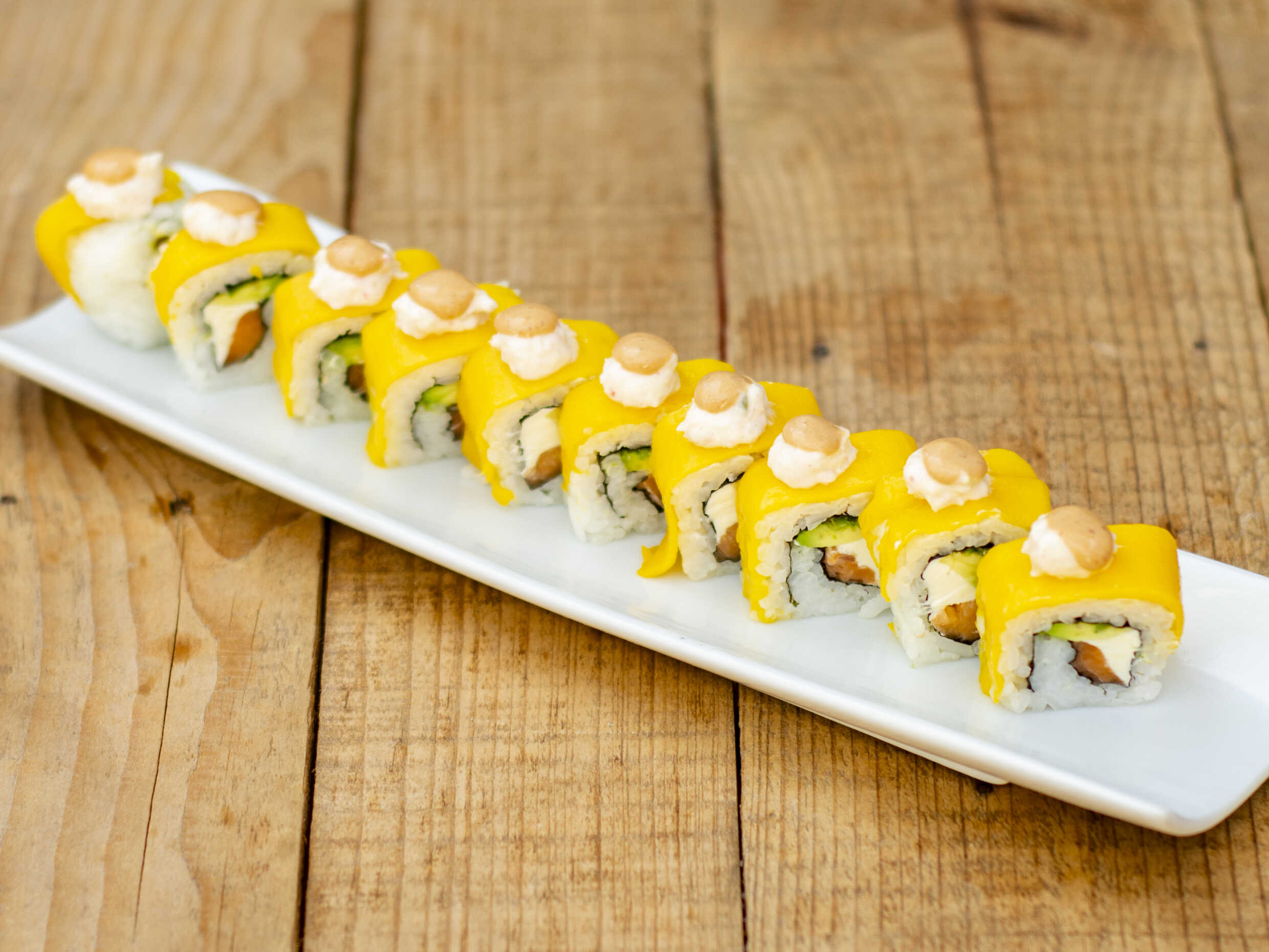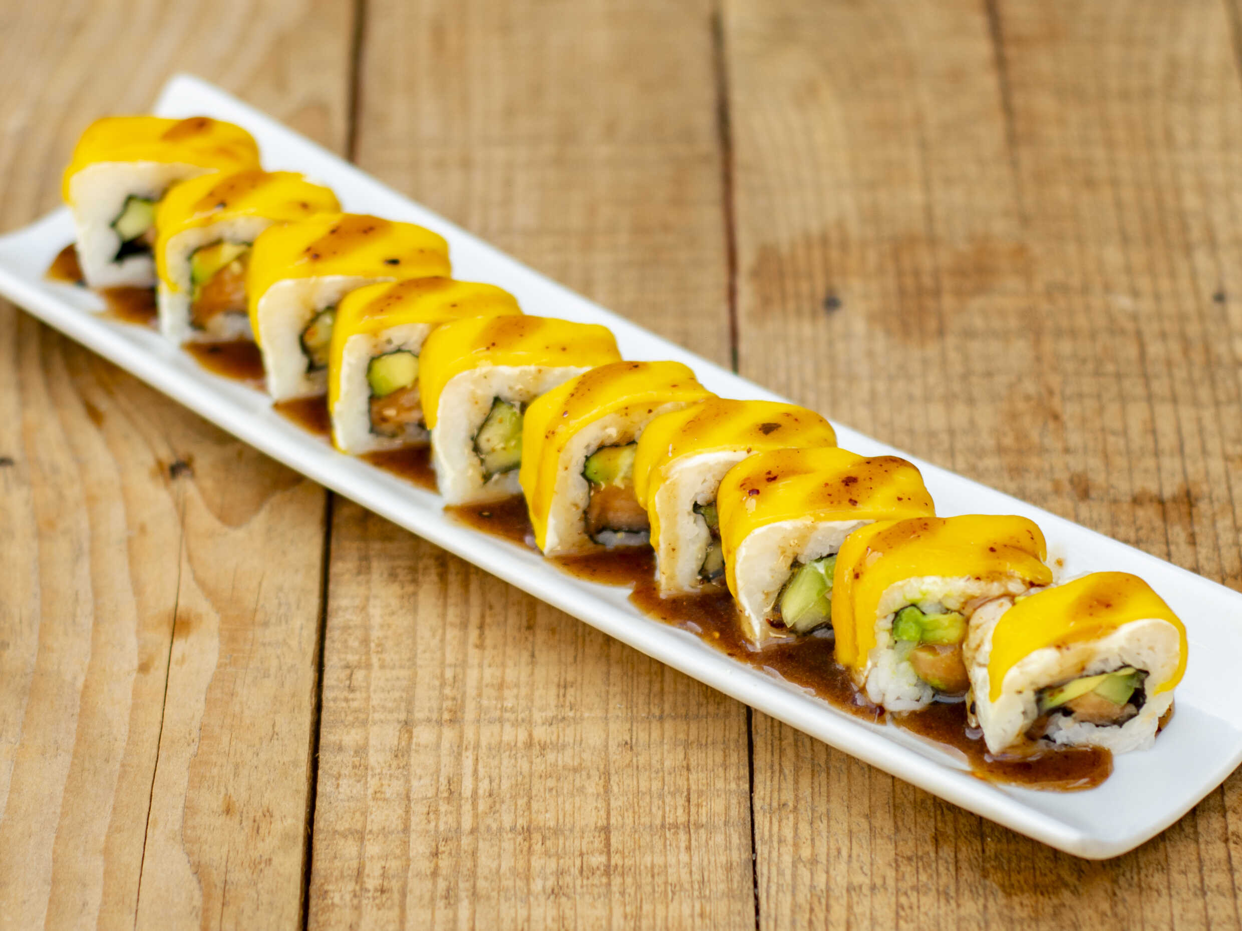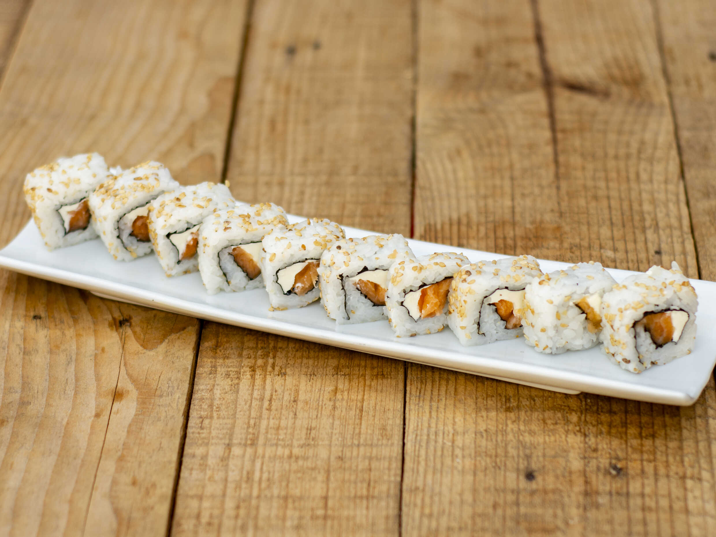 salmón fresco, aguacate y pepino por dentro., queso crema y mango por fuera., servido con nuestra salsa de tamarindo