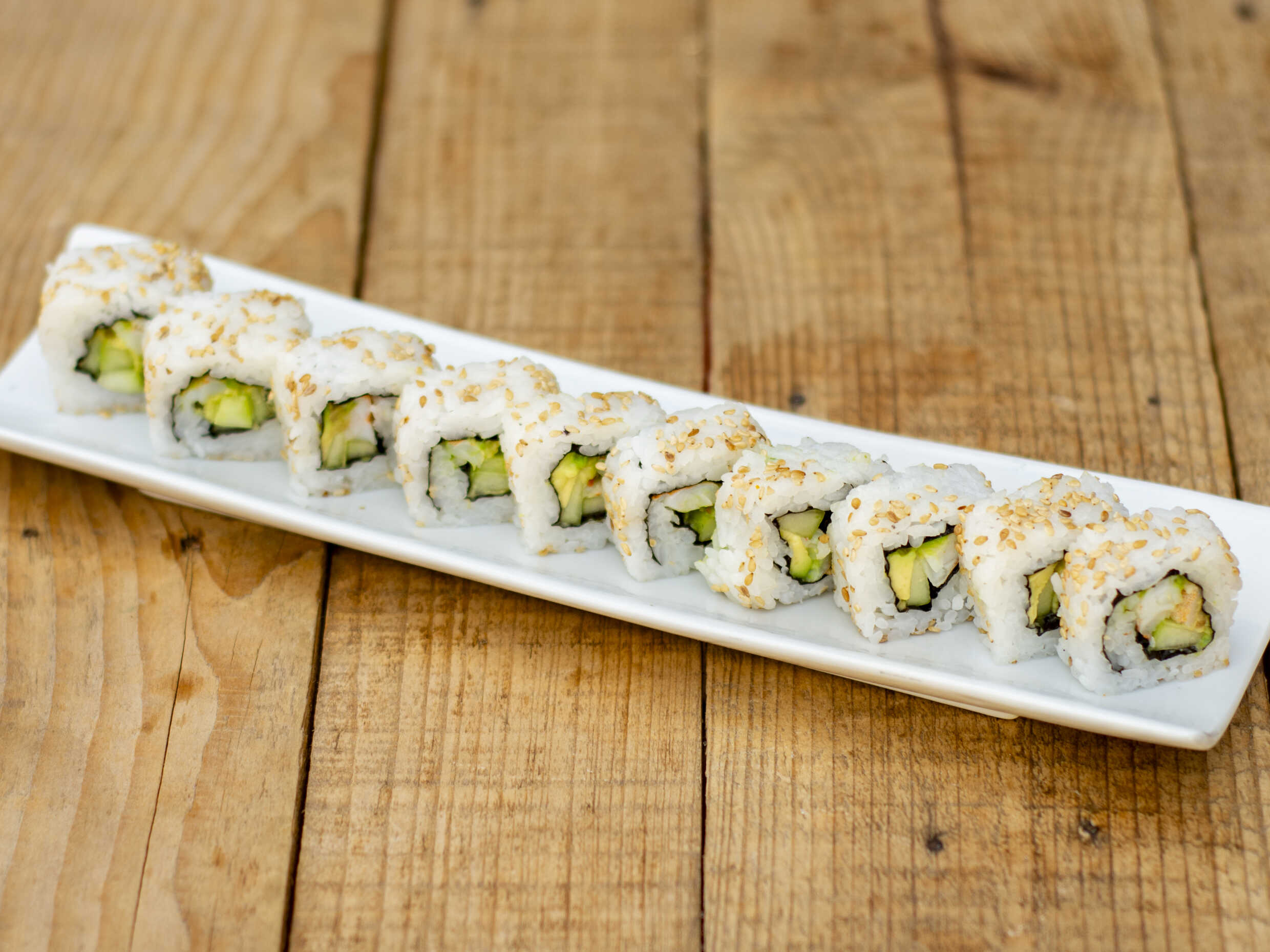 Aguacate, pepino y camaron por dentro; ajonjoli y masago por fuera.