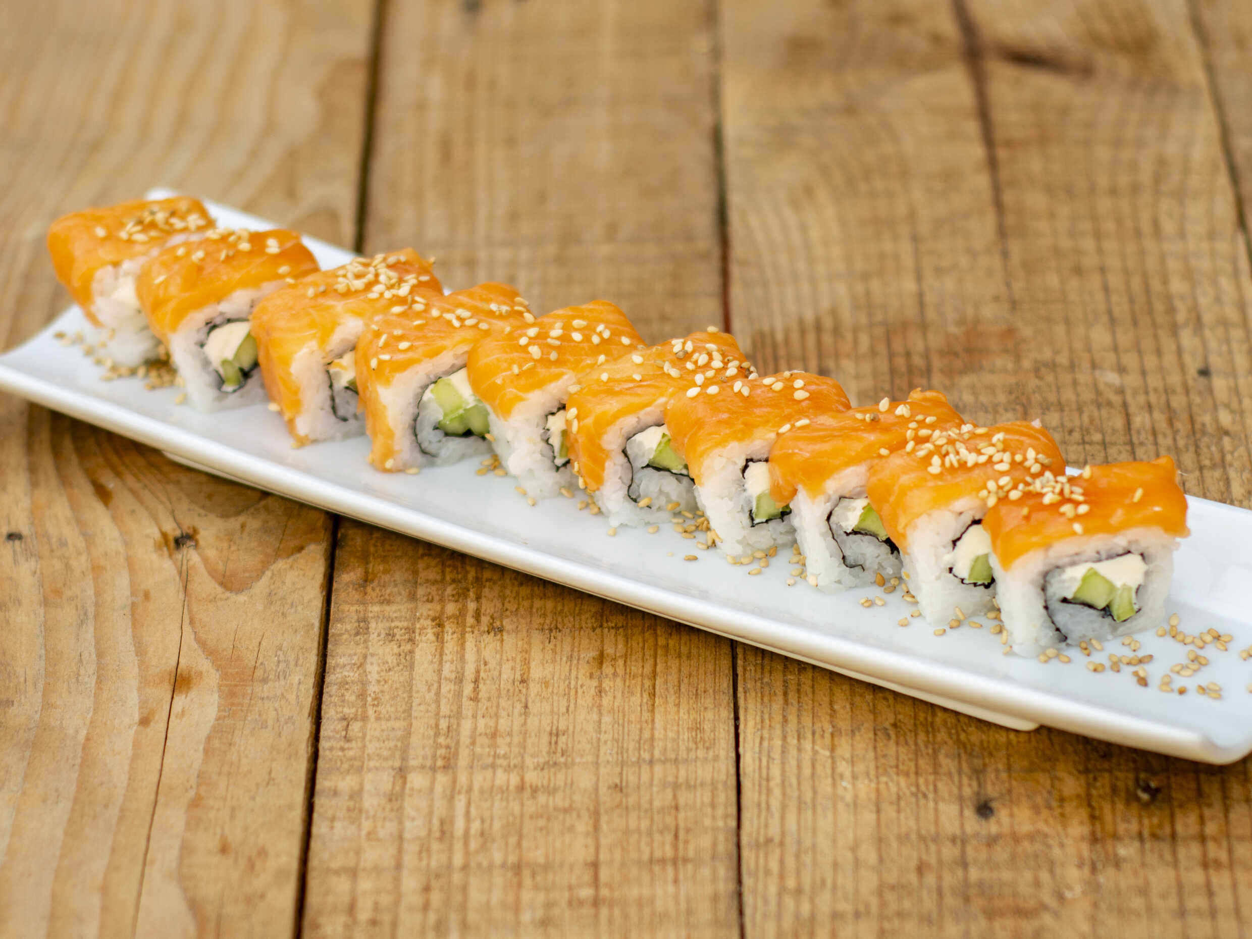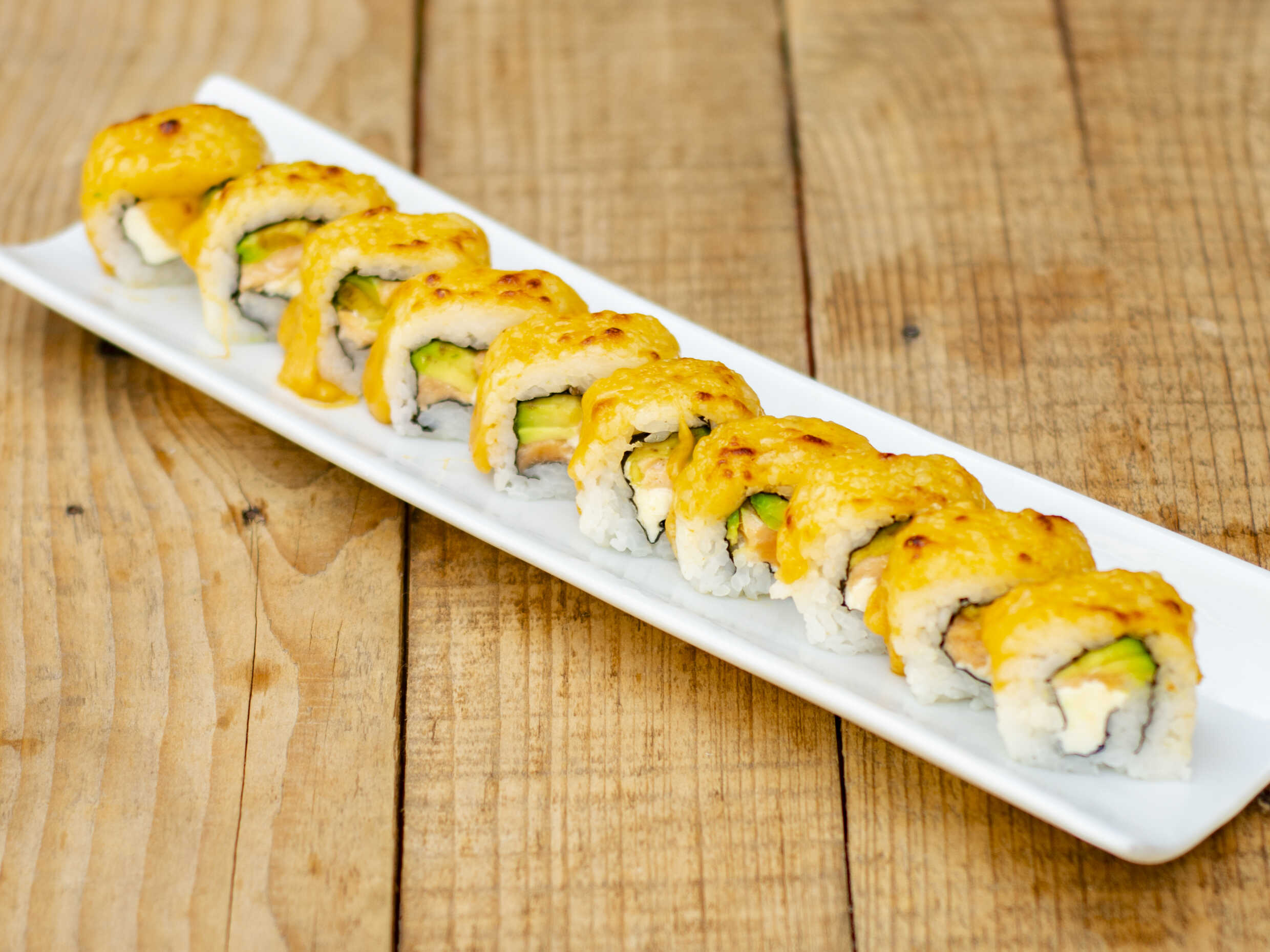 salmon fresco, aguacate y queso crema por dentro; queso gratinado con chipotle por fuera.