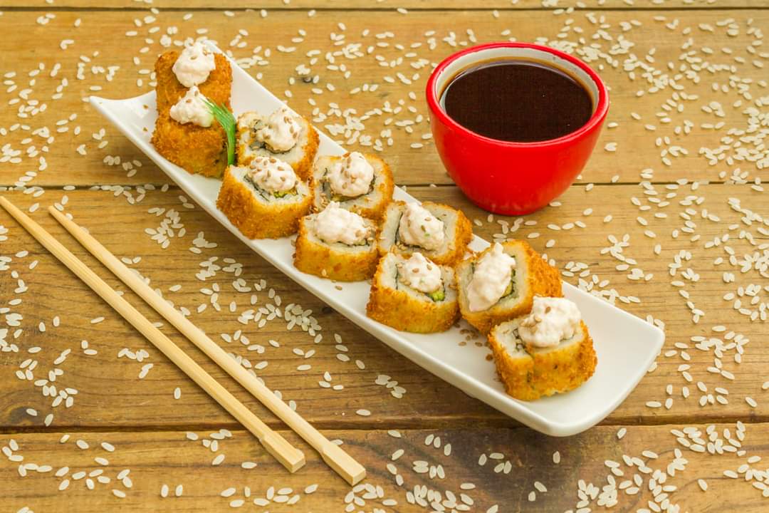 Camarón capeado y aguacate por dentro; queso Filadelfia por fuera; servido con salsa Tampico y ajonjolí.