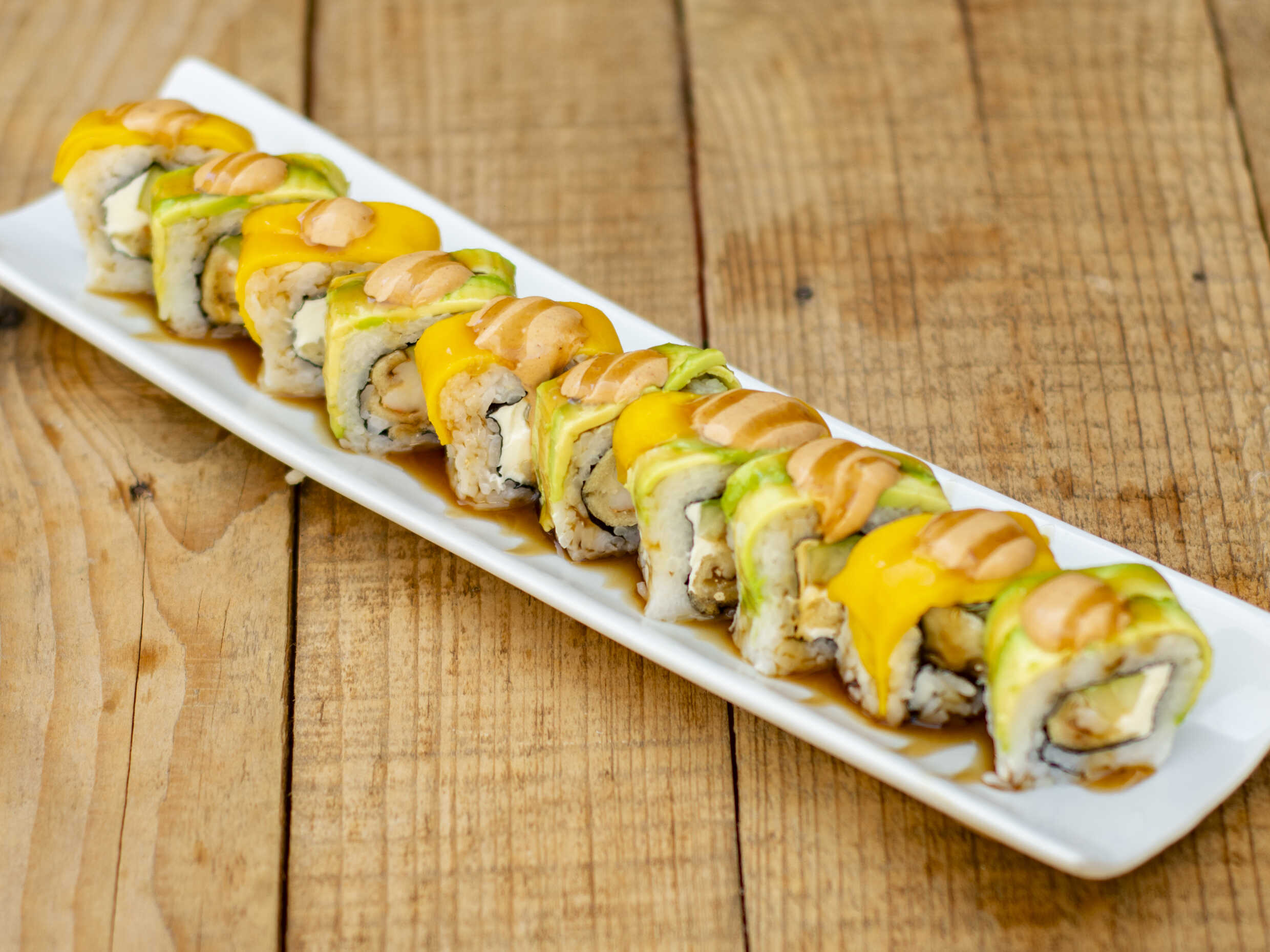 mango y aguacate por fuera., camarón ebi edith y pepino por dentro., servido con salsa chipotle y salsa dulce