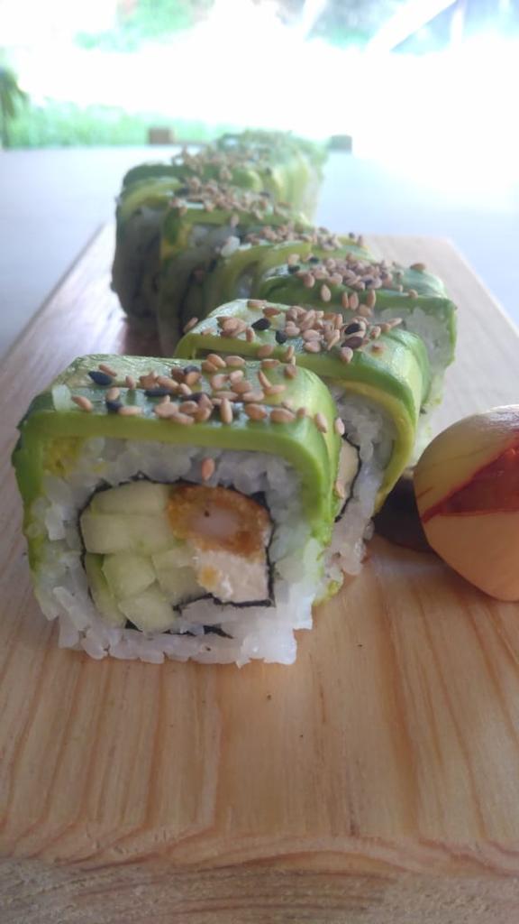 Cangrejo, pepino, queso crema. Envuelto en Aguacate.