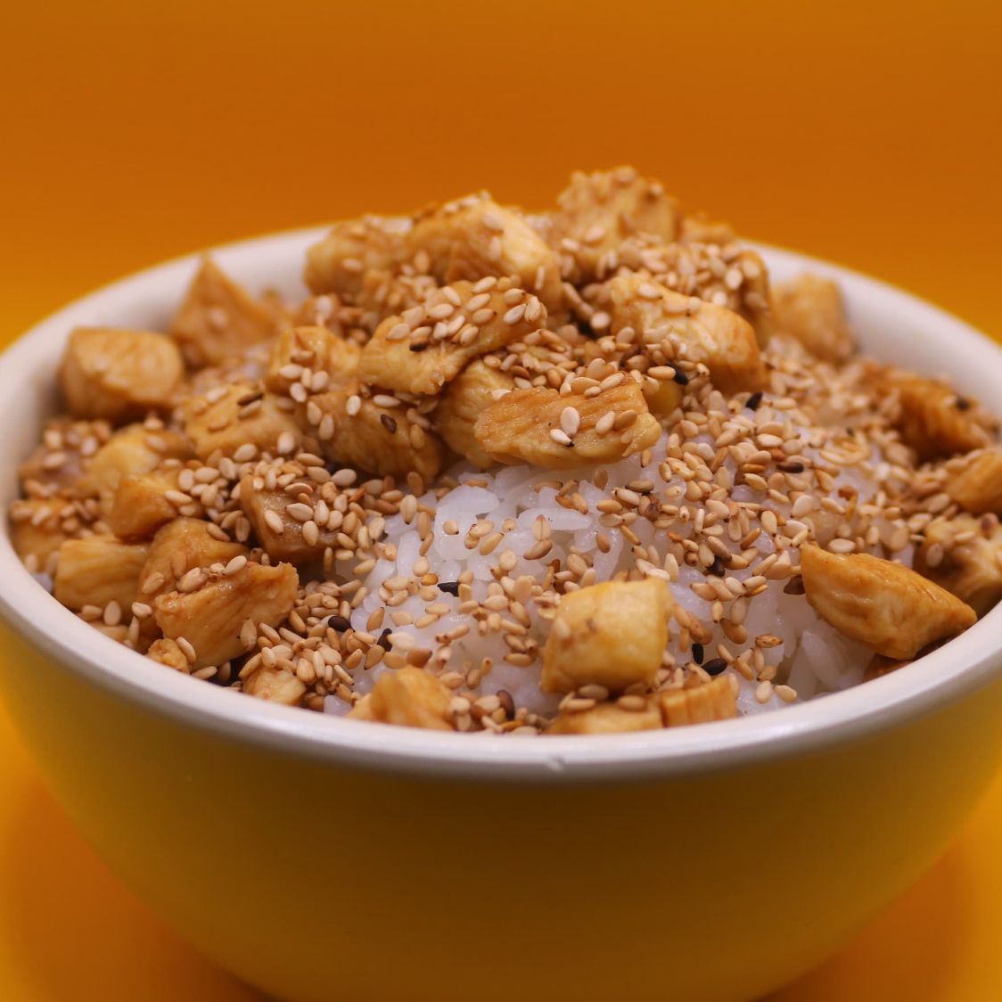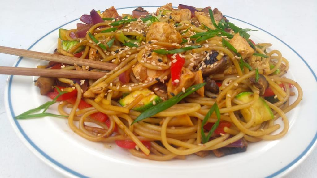 verduras salteadas a la plancha acompañadas con pasta y pollo con la salsa especial del chef, salsa brava. Ajonjolí. Cebollin.