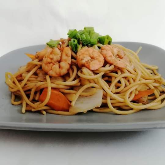 Pollo, camarón, pasta, verduras salteadas y salsa Teriyaki.
