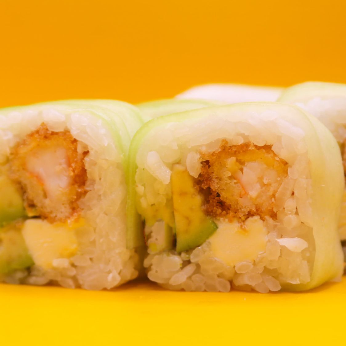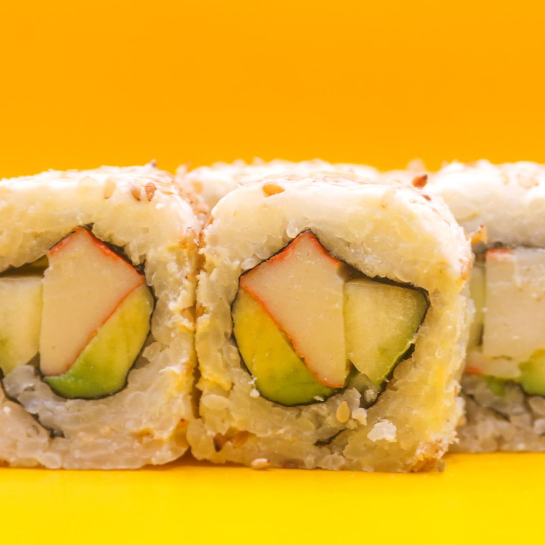 Pepino, Aguacate, Cangrejo, Envuelto en queso y Ajonjolí.