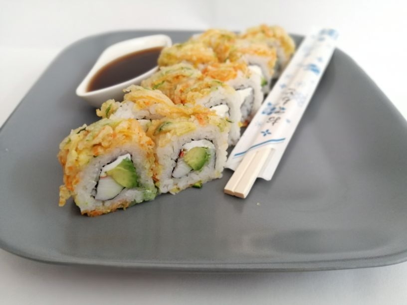 Cangrejo, aguacate, queso crema, envuelto en verdura frita.